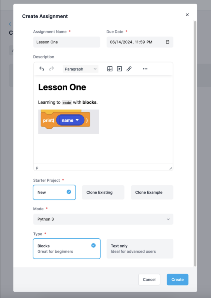 Classrooms in EduBlocks are based around assignments. Assignments make it easy to give your students’ instructions for classwork or homework, collect their work, grade it, and give them feedback.