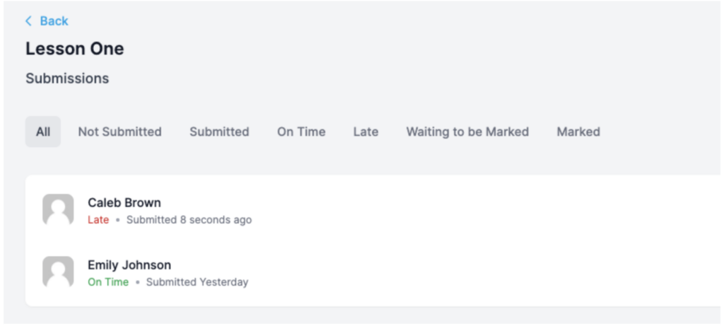 From here, you will be able to see which students have started an assignment, and for those that have completed the work, whether or not they have submitted on time.