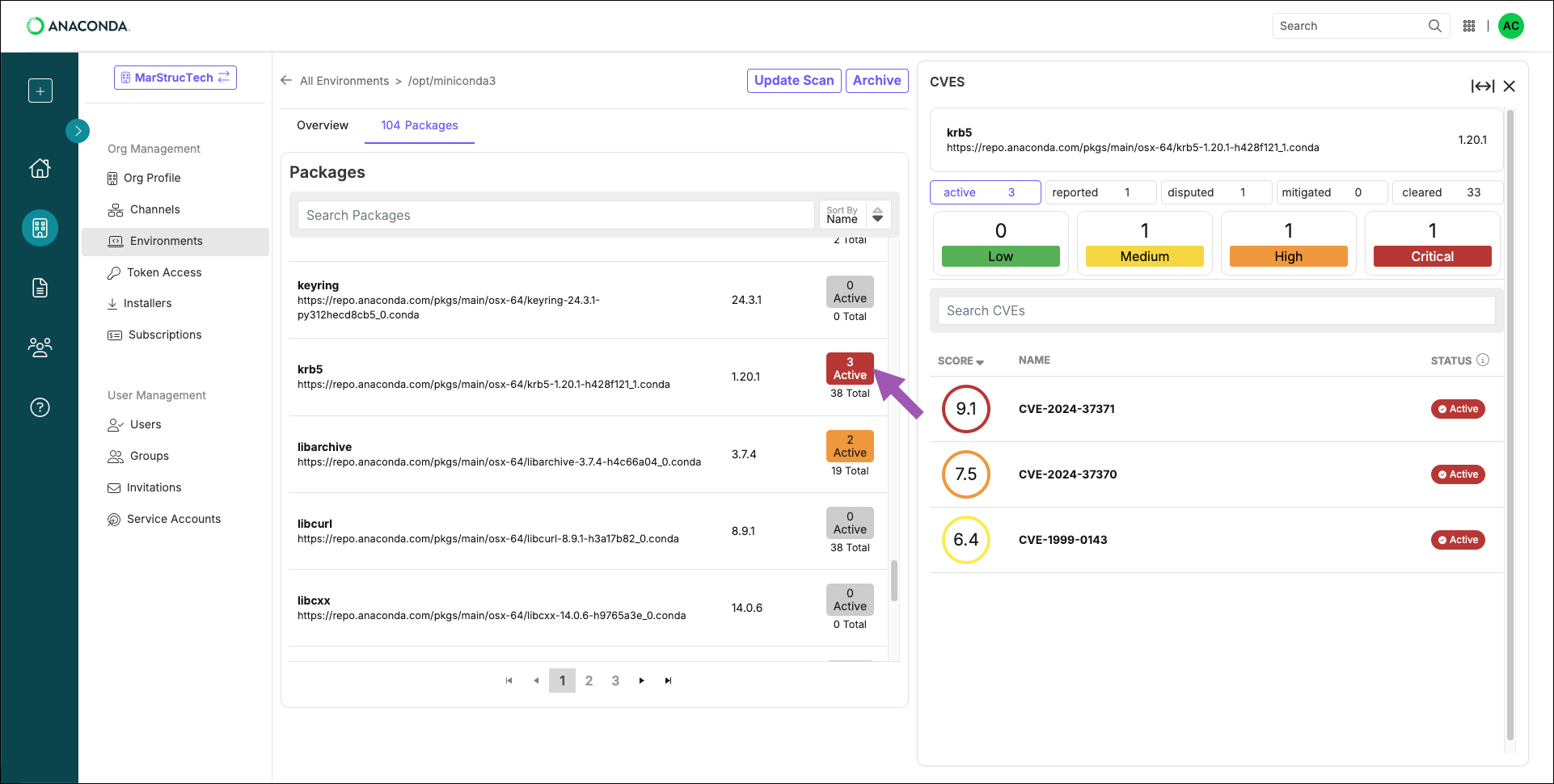 Scanning an environment checks the most recently saved conda environment log for CVEs associated with the packages it contains.Environments are automatically scanned when created, but not when they are logged or when the log updates. To ensure an accurate assessment of an environment’s current CVE state, perform a scan before you explore it in Anaconda.com. You can also scan environments locally to identify potential issues immediately.