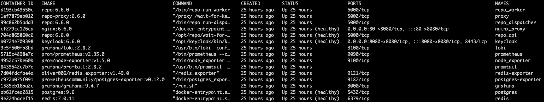 STATUSofUp(not stuck in a restart loop) in the output:These containers should always be running. However, you might see additional containers, depending on the phase of installation or your initial configuration choices:Additional containers