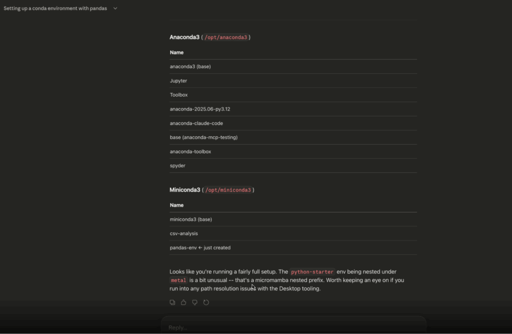 This ships alongside conda-meta-mcp, built by Daniel Bast and Jannis Leidel from the conda open source community. Where Anaconda MCP covers your local environment, conda-meta-mcp covers the broader ecosystem: authoritative, real-time package metadata across conda-forge and other channels. This is the first chapter of Anaconda’s broader MCP story, with more to come later this year.
