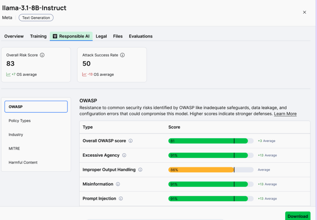 - Deploy with quantifiable security confidence. Models are evaluated against OWASP and MITRE frameworks with robustness scores you can present to security and compliance teams.