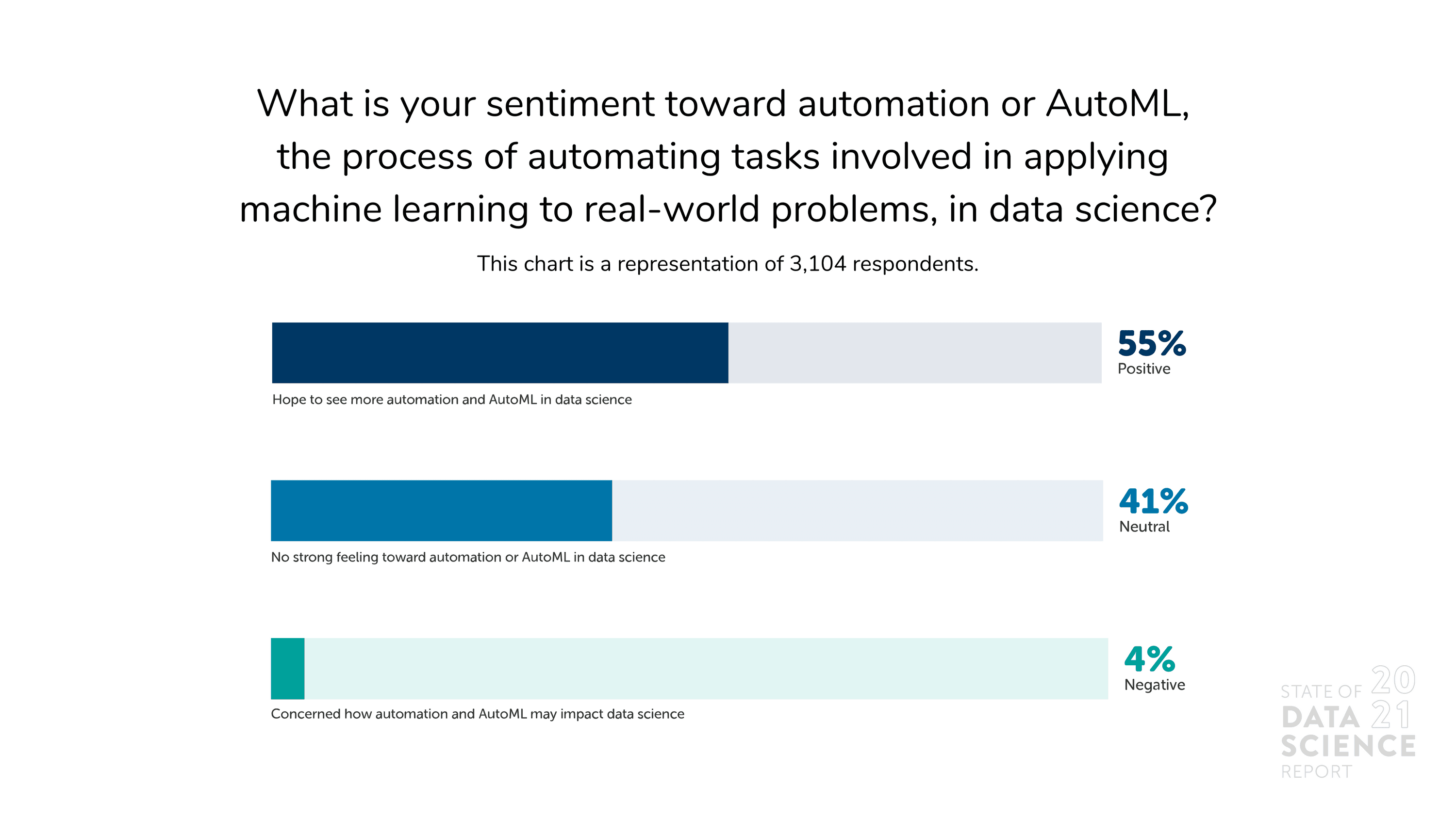 Few data scientists appear worried that machines are coming to replace them. On the contrary, they see the pairing of data science and AI as an opportunity for automation to help with easily repeatable tasks to free up more resources for work that requires human intervention, interpretation, and problem-solving. Simply put, automation will allow people to develop more complex models or algorithms and spend less time on routine work. It’s no surprise, then, that only 4% of respondents to our survey hold a negative view of AutoML, while 55% have a positive sentiment toward it.