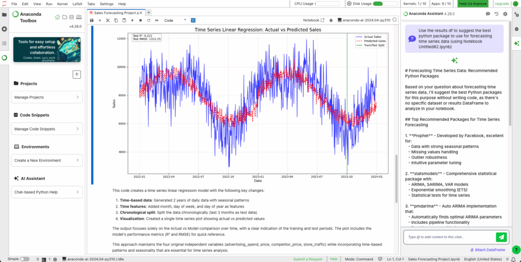 The fastest approach: Open the Anaconda AI Assistant in your Jupyter Notebook (click the green sparkles icon – requires Anaconda Toolbox). Simply explain what you are trying to do (“I need to forecast next week’s sales based on historical data”), and the AI Assistant will suggest the packages and even give you a code snippet example to get you started right away!