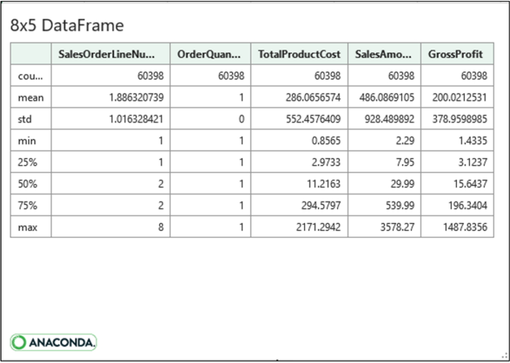 The DataFrame describe() method returns a DataFrame containing the profiling details. Clicking on the card in the formula cell displays the profiling results: