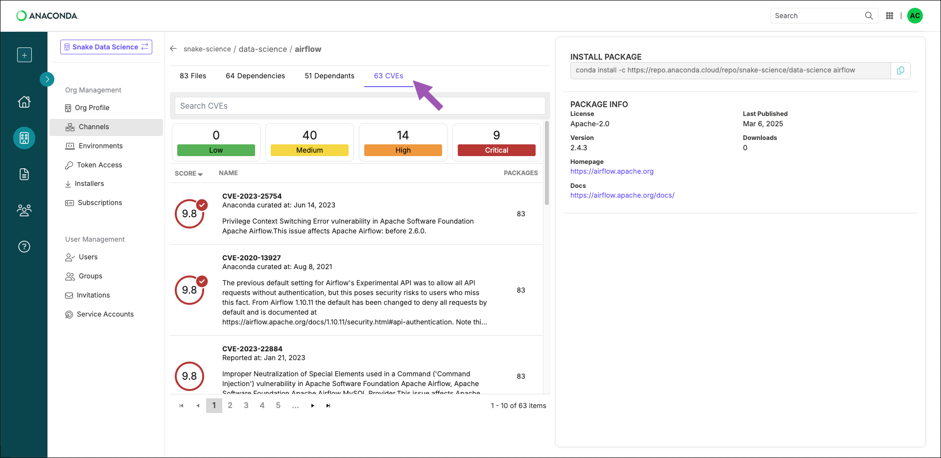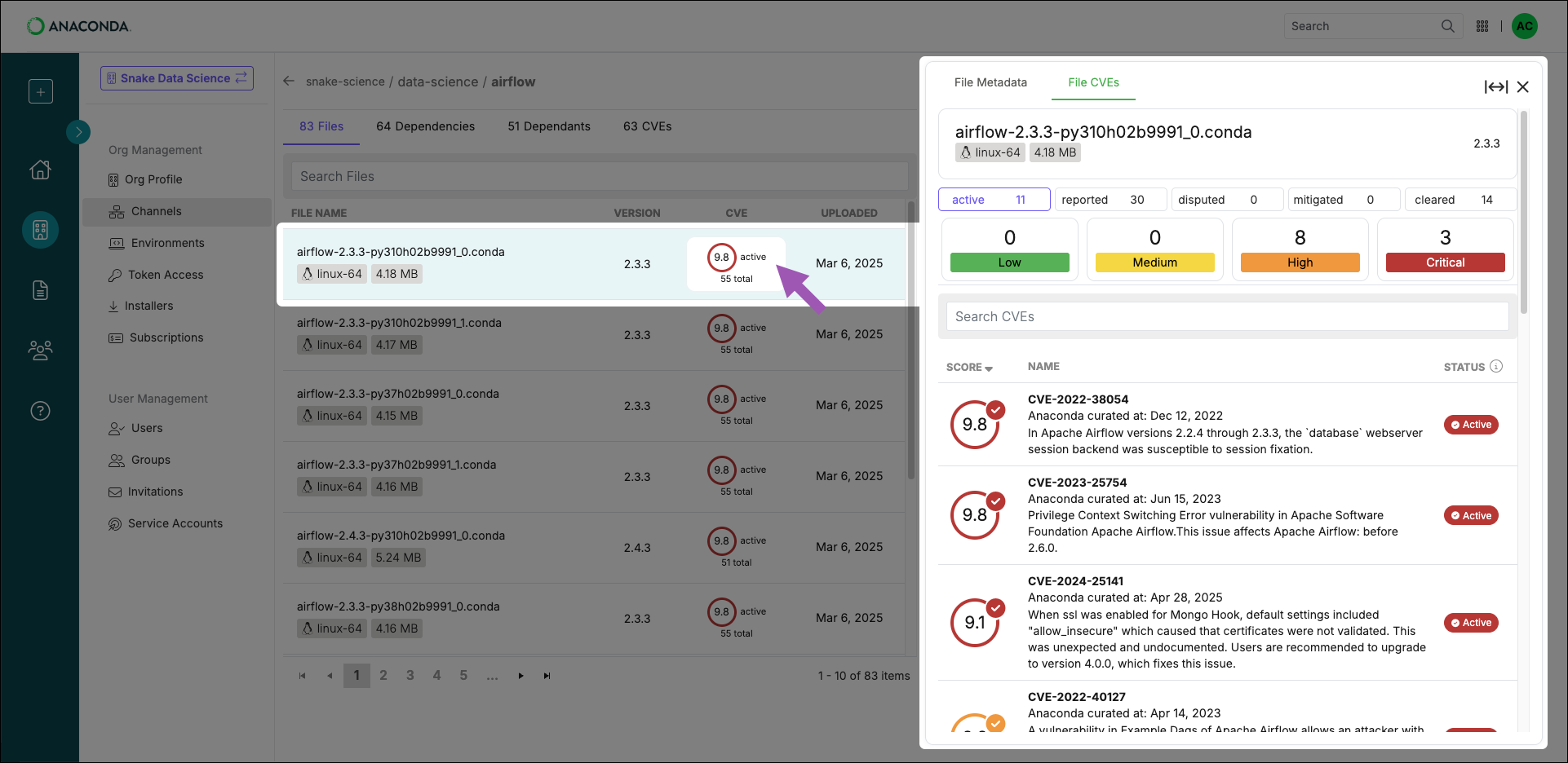 CVEs are weaknesses in software that can be exploited to access sensitive information, such as credit card numbers or social security numbers. Because modern software is complex with its many layers, interdependencies, data inputs, and libraries, vulnerabilities tend to emerge over time. Knowing when and how the code you use is vulnerable to attacks is a powerful tool in allowing you to mitigate the potential for harm, and Anaconda provides you with everything you need to keep your pipeline secure. To learn more about CVEs and how Anaconda mitigates and manages them, watch the State of Data Science webinar.Why trust Anaconda?