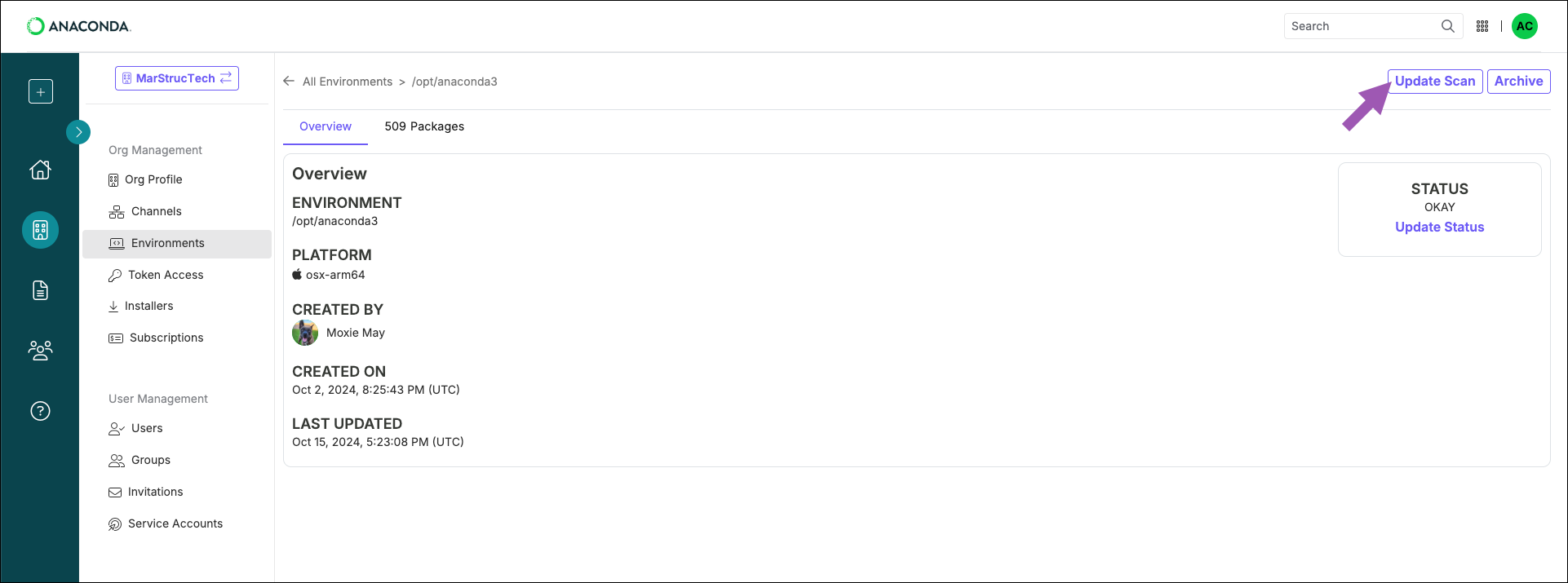 anaconda-audit. For more information on obtaining anaconda-audit, see Installing required plugins.If you are an administrator, you can instruct your members to register their environments with your organization. Once registered, all newly created environments will be logged, scanned for CVEs, and displayed in Anaconda Platform. For more information on registering environments with your organization, see Registering your organization.- Scanning locally