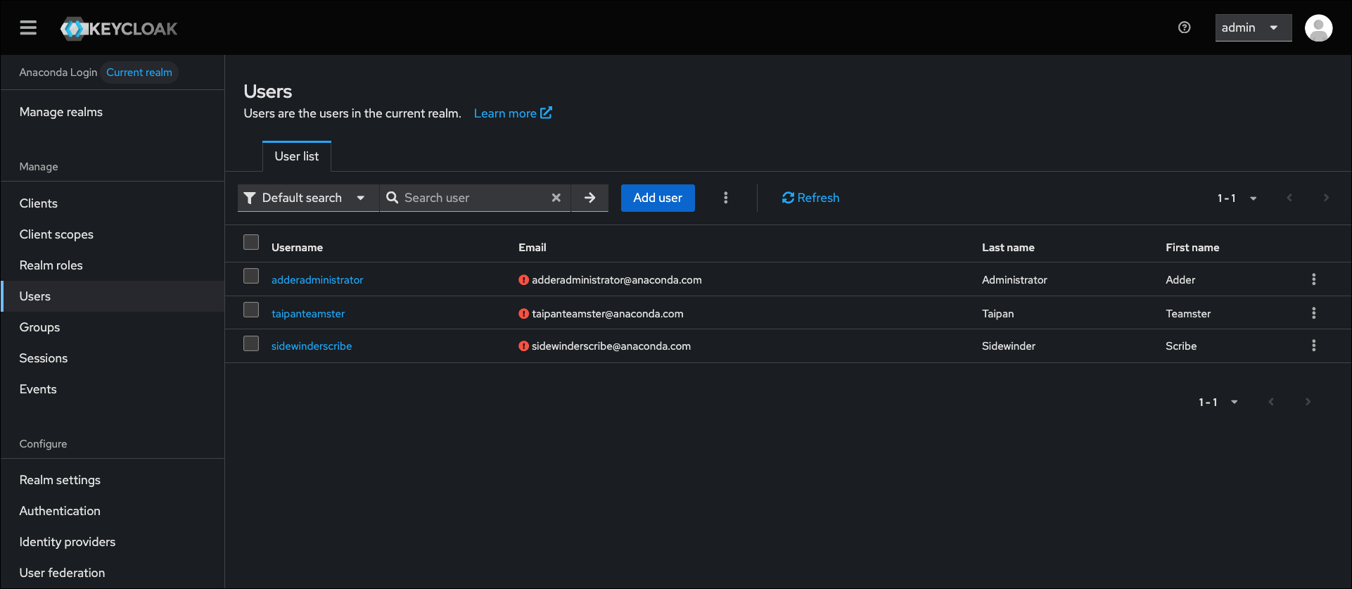 If you want to provide access to Anaconda Platform for a new member of your organization, you need to add their identity information into Keycloak. To create a user, complete the following steps:- Access the Keycloak administrative console.