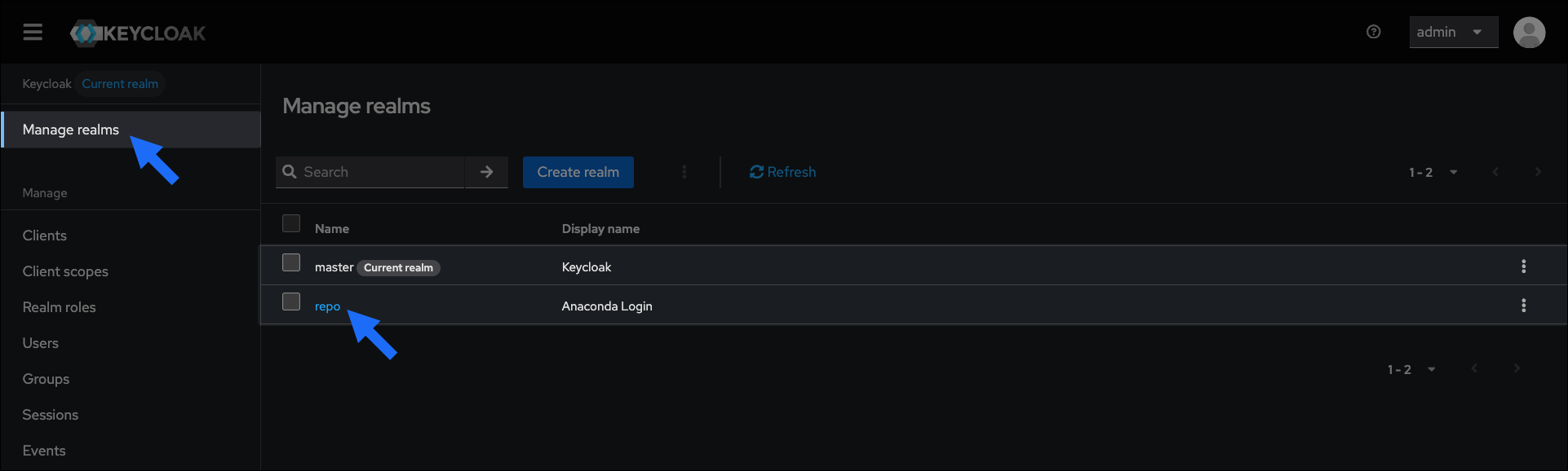 In Keycloak, a realm is an isolated space containing all the necessary information to manage the authentication and authorization of users on a specific domain. Each realm has its own set of users, permissions, and client applications. The master realm is the system realm for Keycloak itself. Adding a user to the master realm allows them to log in to the Keycloak administrative console using their own credentials. The repo realm manages all other Anaconda Platform users and their authentication settings. It includes standard user accounts and their assigned roles and permissions. Most user management tasks take place in this realm. Further permissions for users on a realm are provided using roles. For more information, see Roles and permissions.Realm selection