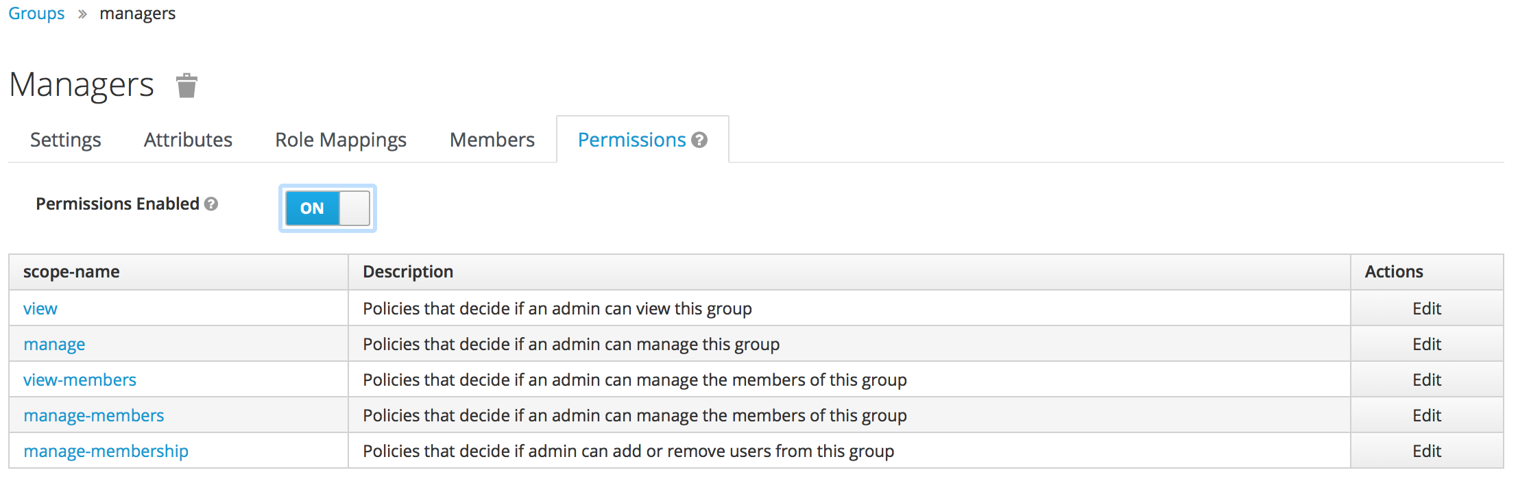 - Use the Permissions tab to enable a set of fine grain permissions to use to define policies for allowing Admin users to manage the group. See the section below to understand how to configure permissions by role.