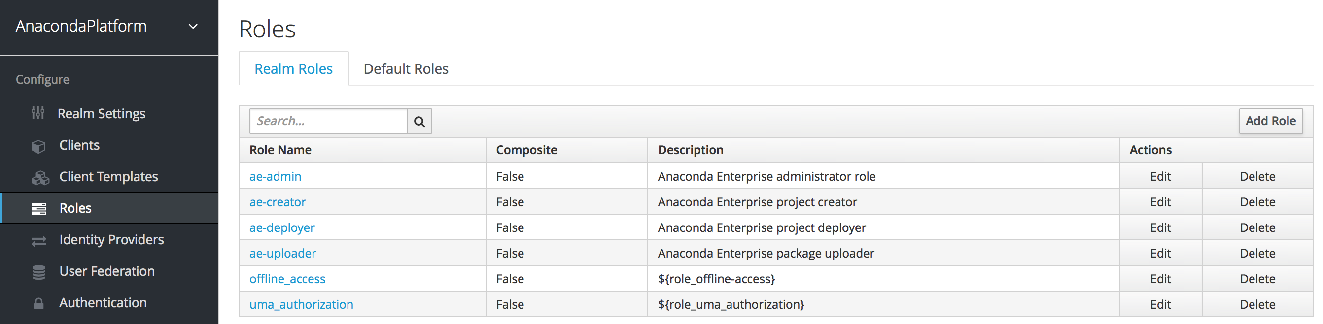 - In the Configure menu on the left, click Roles to display a list of roles configured for use with Anaconda Enterprise. To get you started, Anaconda Enterprise provides a set of “realm” roles. You can use these system roles as is, or as a basis for creating your own.