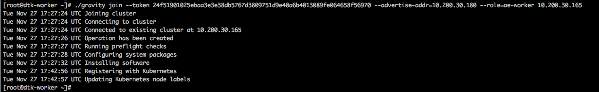 JOIN-TOKEN= The join token that you obtained in Step 3.NODE-IP= The IP address of the worker node. This can be a private IP address, as long as the network it’s on can access the AE master.NODE-ROLE= The type of node you’re adding:ae-worker,gpu-worker, ork8s-master.CLOUD-PROVIDER= This is auto-detected, and can therefore be excluded unless you don’t have Internet access. In this case, usegeneric.MASTER-IP-ADDR= The IP address of the AE master that you obtained in Step 3.The progress of the join operation is displayed:The--roleflag must be provided and assigned to eitherae-worker,gpu-worker, ork8s-master. Without it, the node will be added with the roleae-masterand may cause your cluster to crash.
