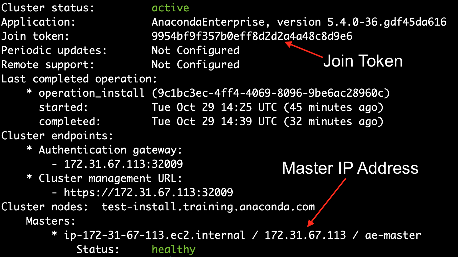 - Copy and paste the join token for the cluster and the IP address for the AE master somewhere accessible. You’ll need to provide this information when you add a new worker node. You’ll also need the IP address of the server node you’re adding.