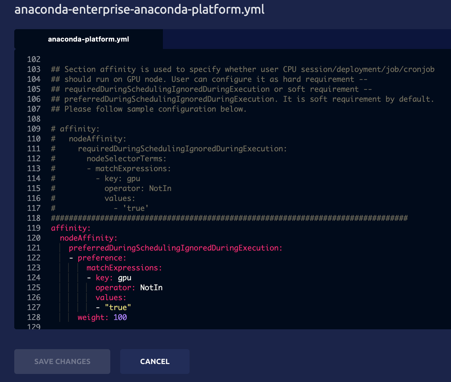 anaconda-enterprise-anaconda-platform.ymlconfiguration file. - Make a manual backup copy of this file before editing it, as any changes you make will impact how Anaconda Enterprise functions.