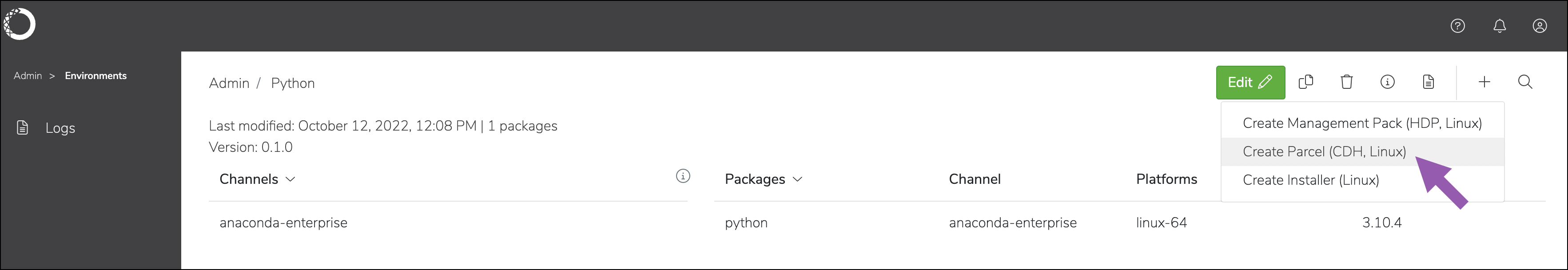 When working with CDP, create a parcel containing the conda environment you have created, then import the parcel into your CDP cluster.- Create the environment.