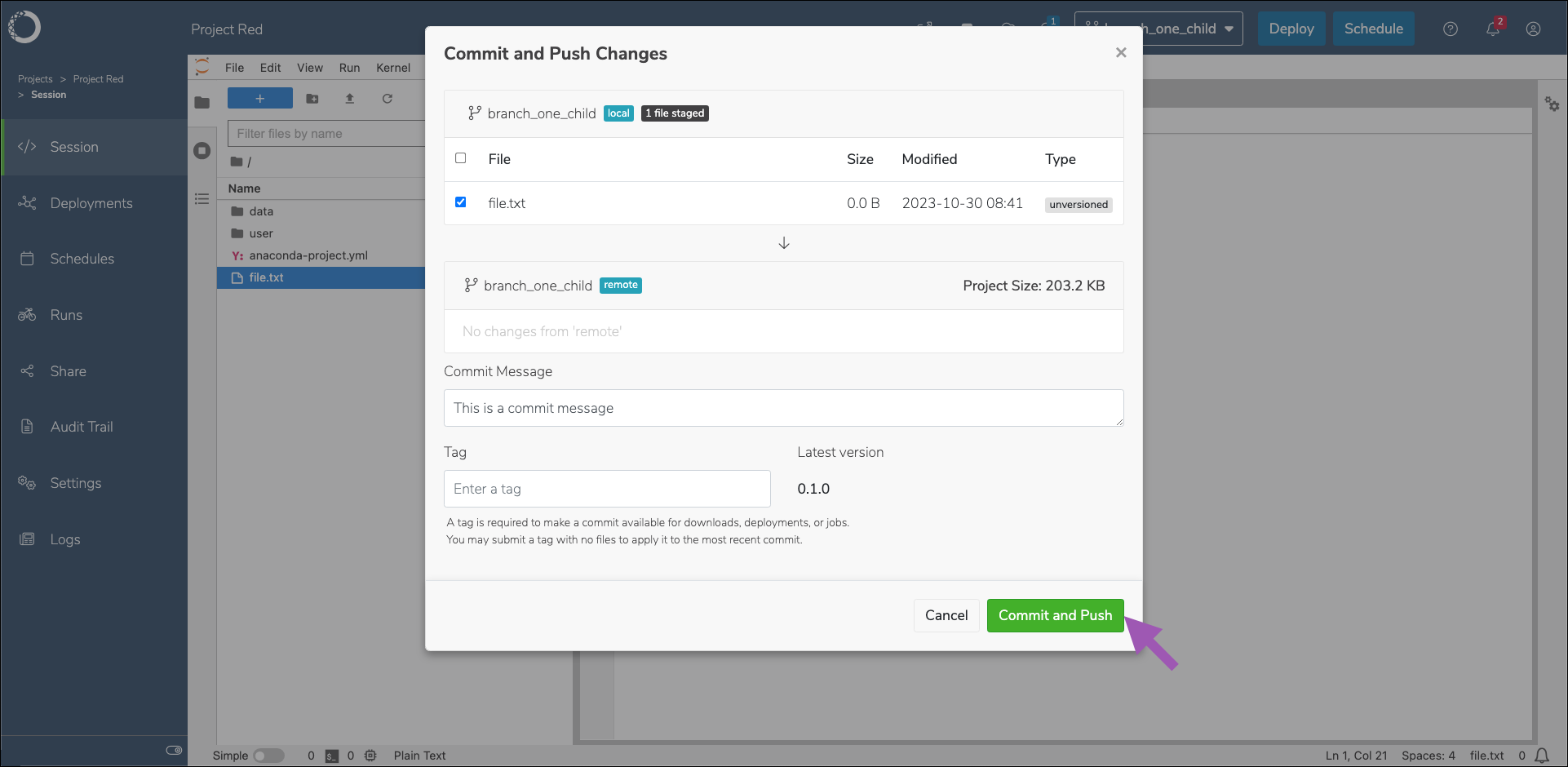 There is currently no method for deleting a branch from the UI. This feature will be added in a later release. However, you can still delete branches from your project manually if necessary. To delete a branch from a project:- Open your project and start a session.