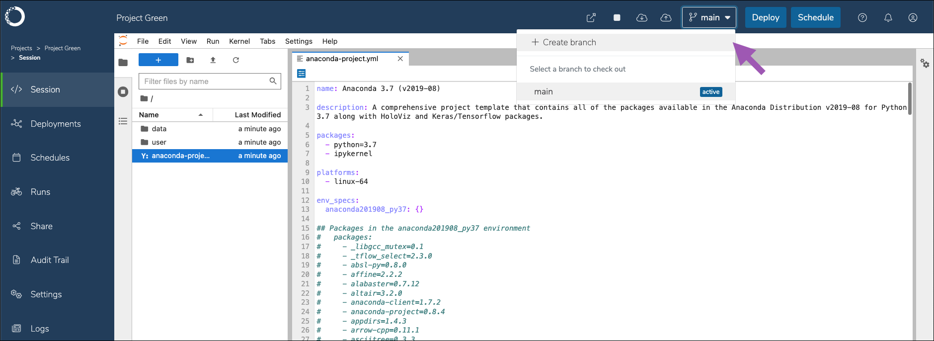 New branches are always created off of the currently active branch. From the projects page:- Open your project and start a session.