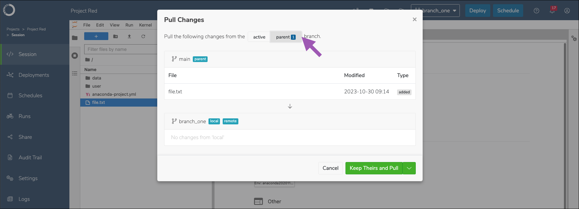 If the parent or remote branch has changes applied to it that the active branch does not, you must pull the changes into your local branch to avoid merge conflicts before you push your commits.- Click the Pull icon.