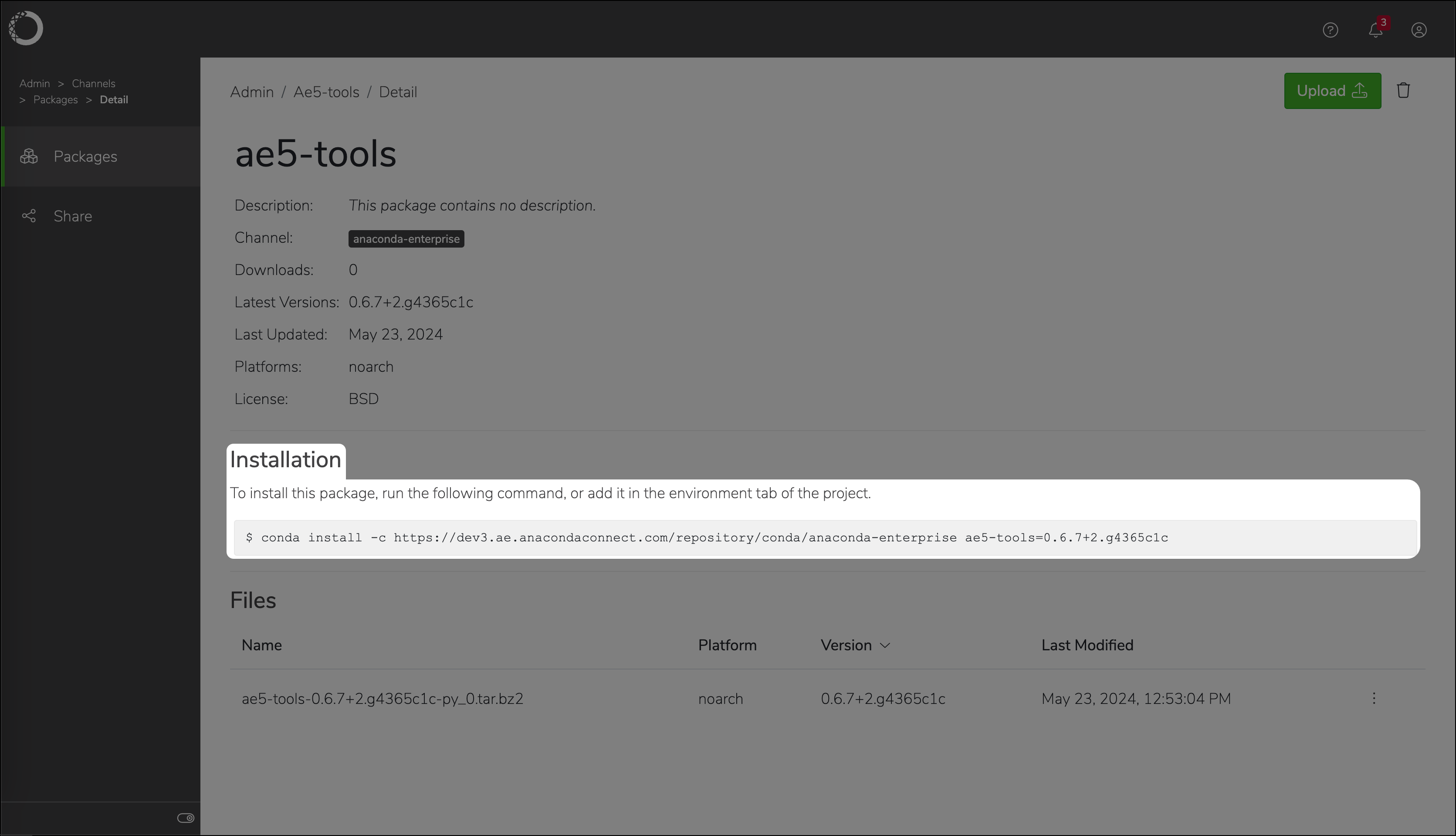 Each package in Workbench presents valuable information pertaining to the package, such as its platform architecture, version, license, number of downloads, and the last time the package was updated. You can also find a command on this page to assist you with installing the package in your environment. From the channel packages page, select any package to view the package details page.You can search for packages by name to locate them more efficiently.