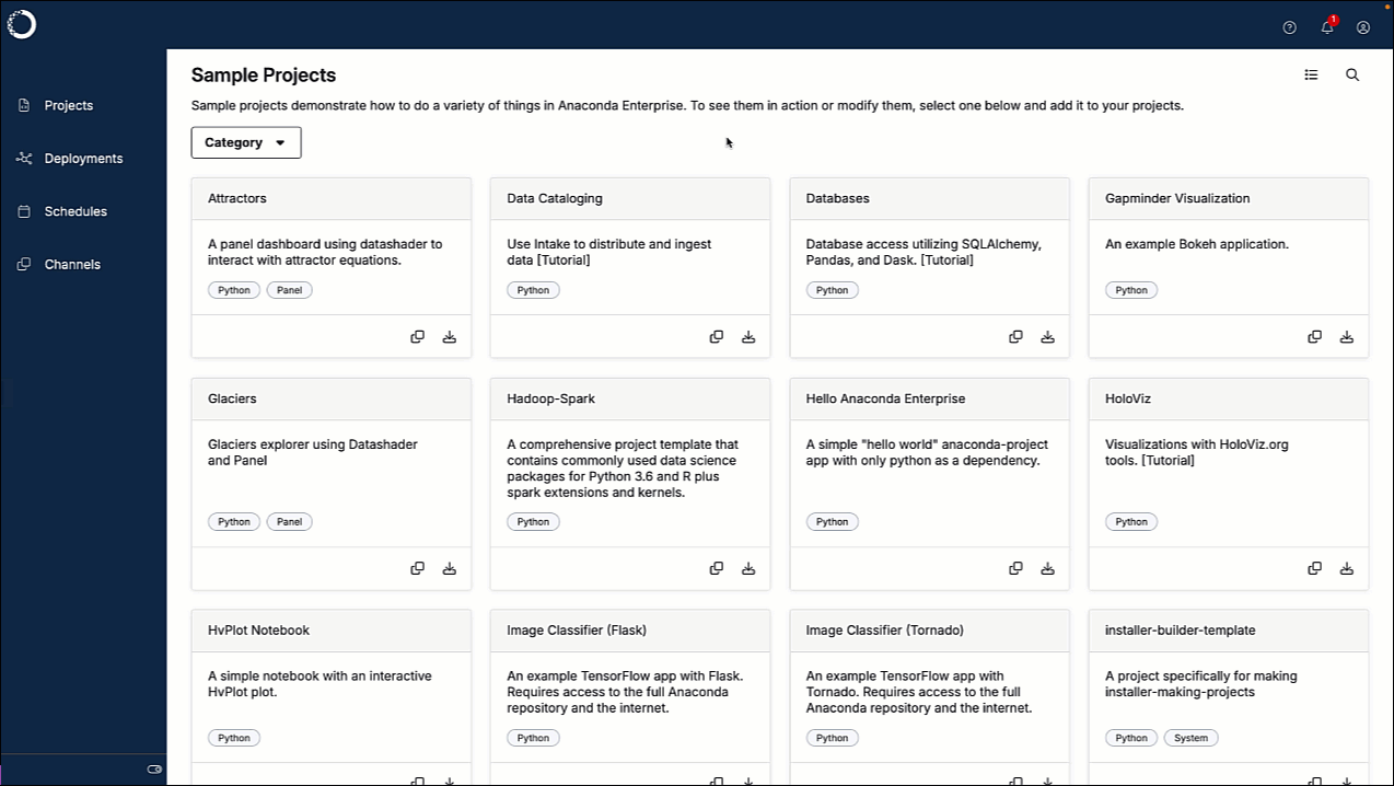 To access the sample project gallery, navigate to the Projects page, then click Sample Projects. Click Add to your projects on any sample project to copy it to the Projects page. Anaconda provides you with a gallery of sample projects that include:- Several base Anaconda Distribution for Python environments