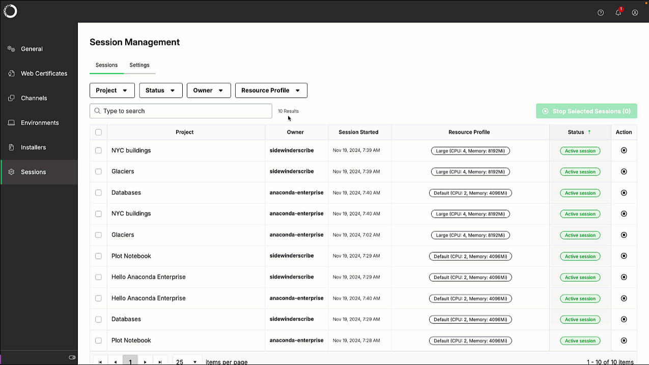 Stopping a project session terminates the pod running that session, releasing its compute resources back to the cluster. Select the sessions you would like to terminate, then click Stop Selected Sessions.