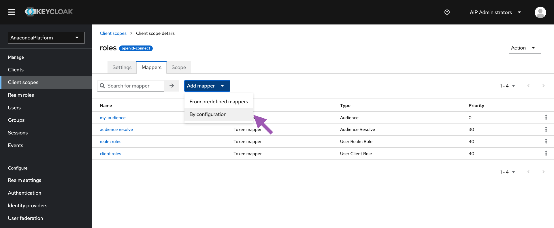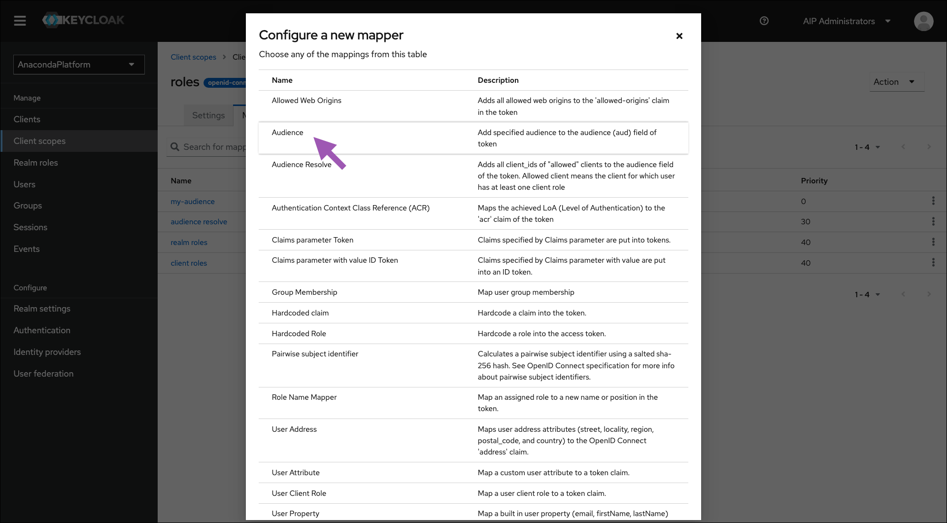 anaconda-platform client, then add a protocol mapper to the roles client scope.