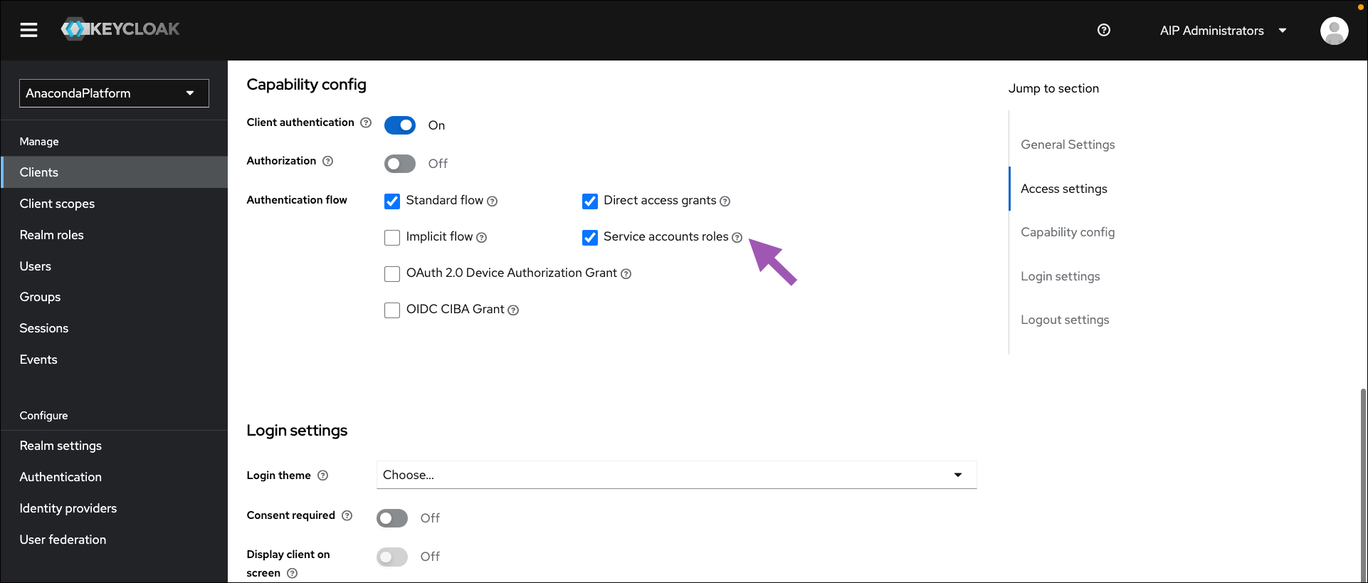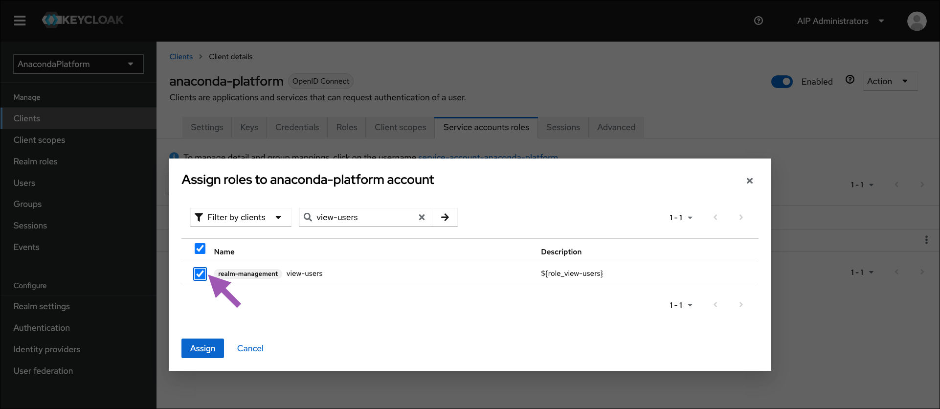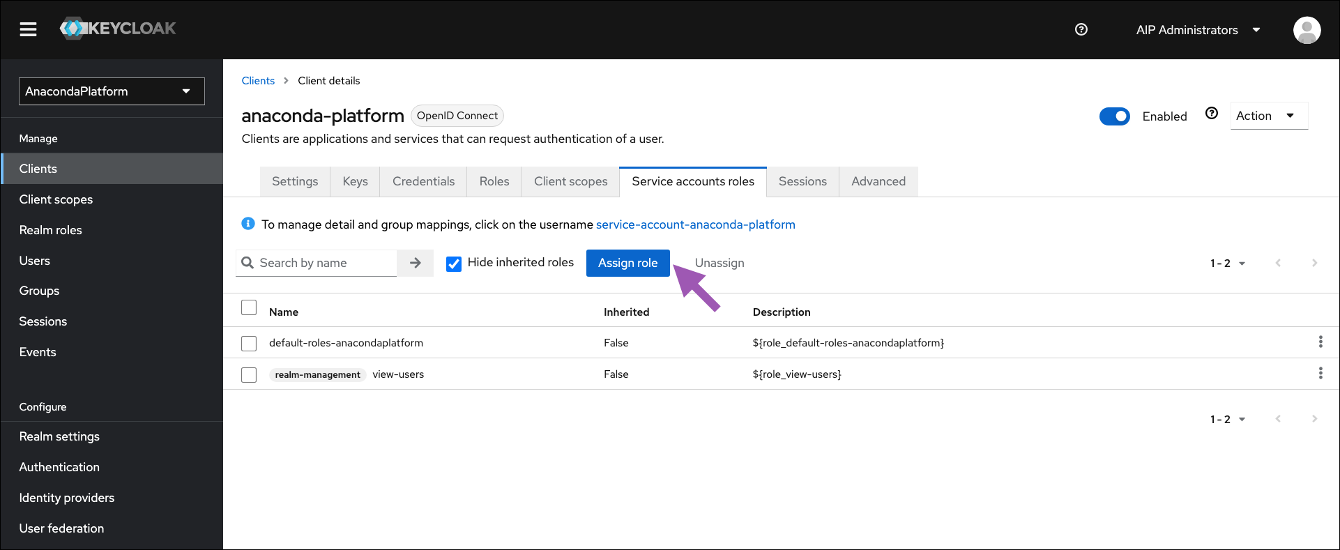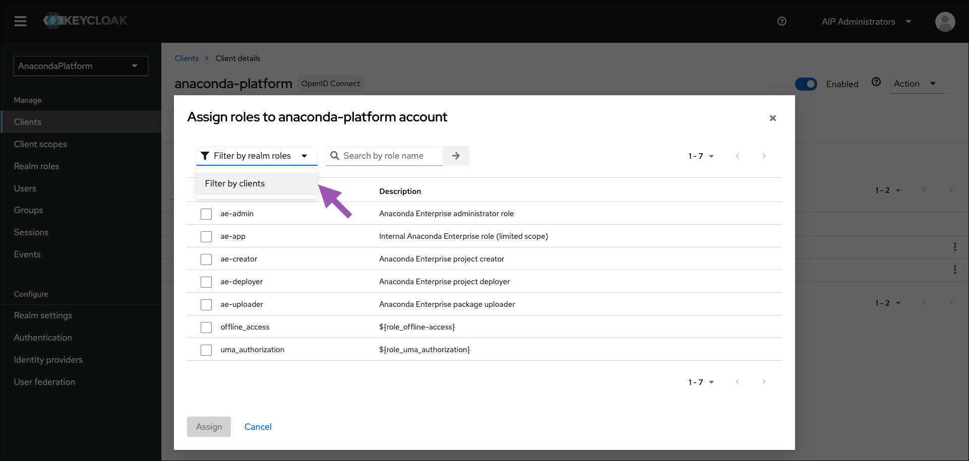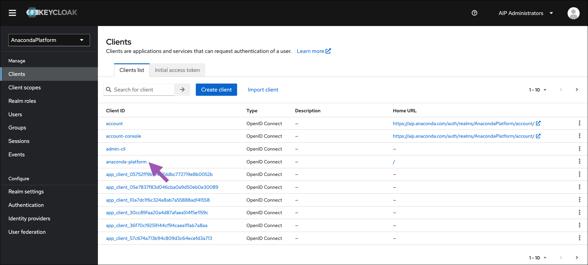 Select Clients from the left-hand navigation, then select anaconda-platform from the list of available clients.