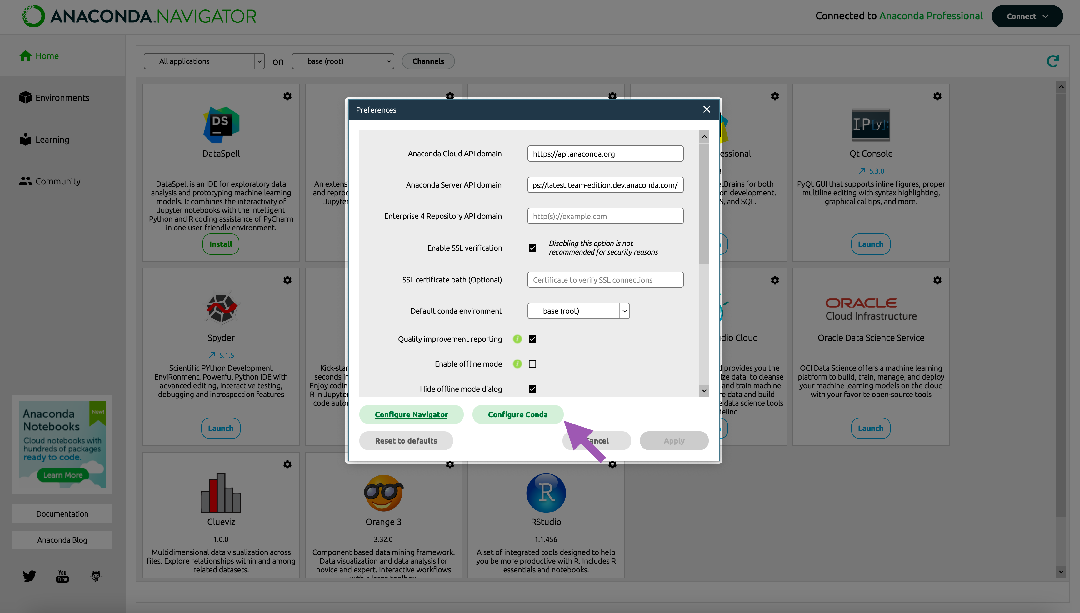 You can view and edit your .condarc file in either Navigator or the CLI: