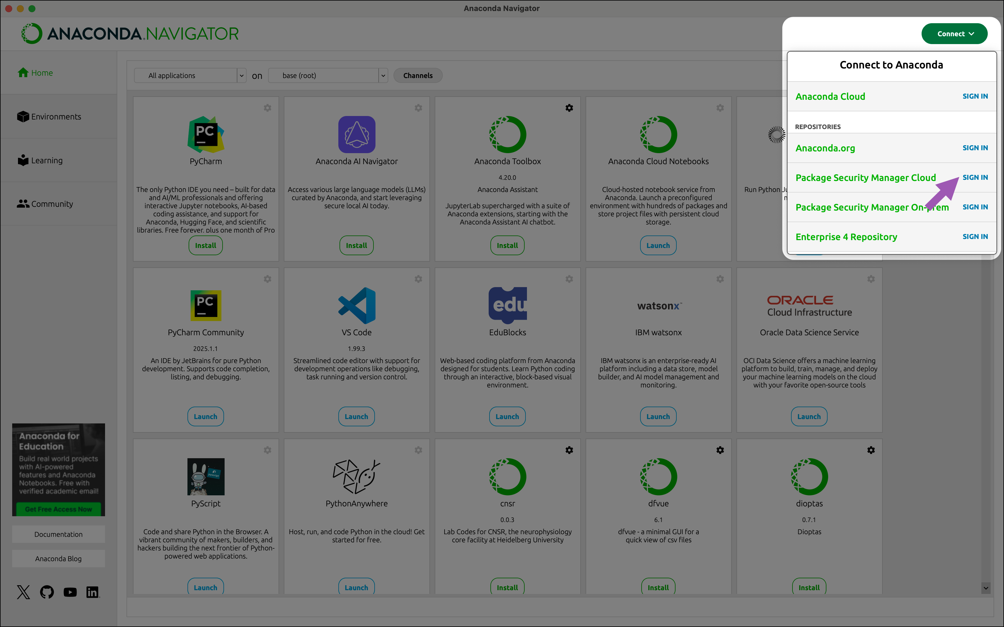Connecting to Anaconda’s premium repository channels requires specific tooling to enable authentication. These tools let you sign in and help you manage access to your organization:-