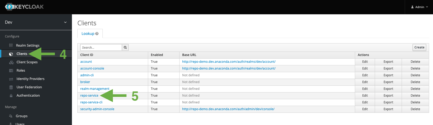 - Log in to Keycloak using the keycloak master realm admin account, and then go to the Clients page under Configure.