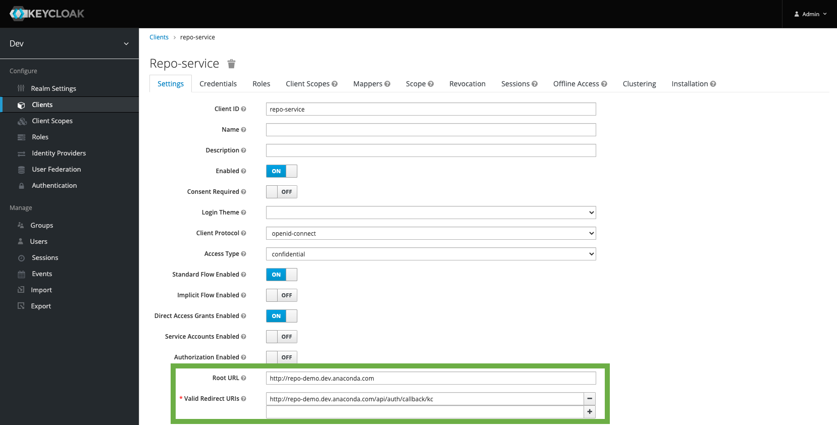 On the Repo-service page, scroll down to the Root URL and Valid Redirect URIs settings.