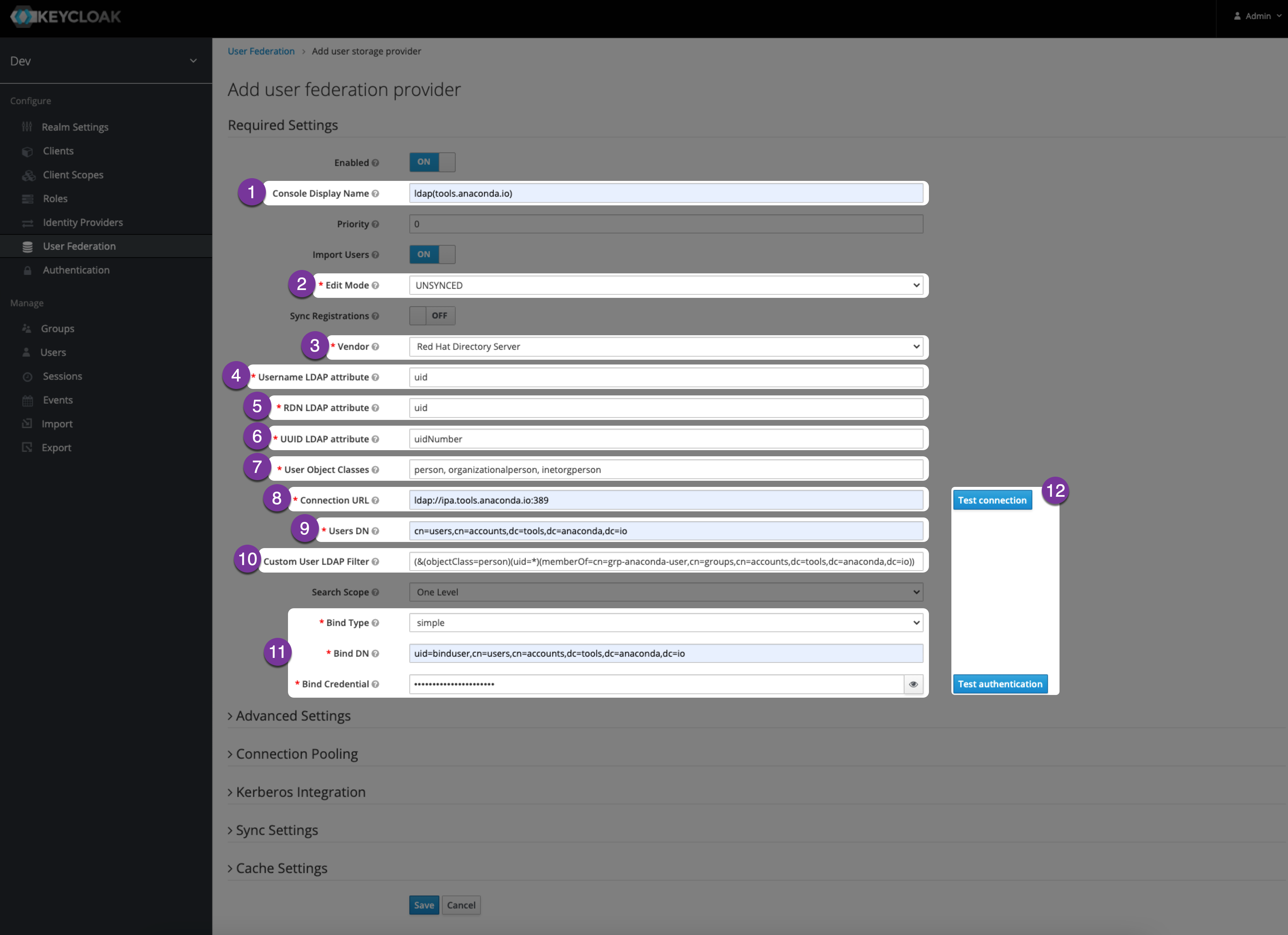 In order to configure Keycloak to validate credentials from your external LDAP server, you need to gather some information about your LDAP directory structure. You’ll use this information to link user attributes (object classes, email, user ID, password, and so on) for use in Anaconda. While you cannot discern a complete picture of your LDAP directory structure from the bind user credentials, you can make some general assumptions about it based on them. For example, if the bind user distinguished name (DN) is:uid=binduser,cn=users,cn=accounts,dc=tools,dc=anaconda,dc=io