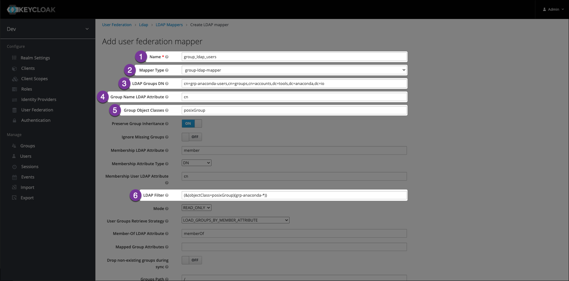 Once user federation is established, you can set up a group mapper for Keycloak to import your LDAP server’s groups automatically for you. Once again, use theldapsearch