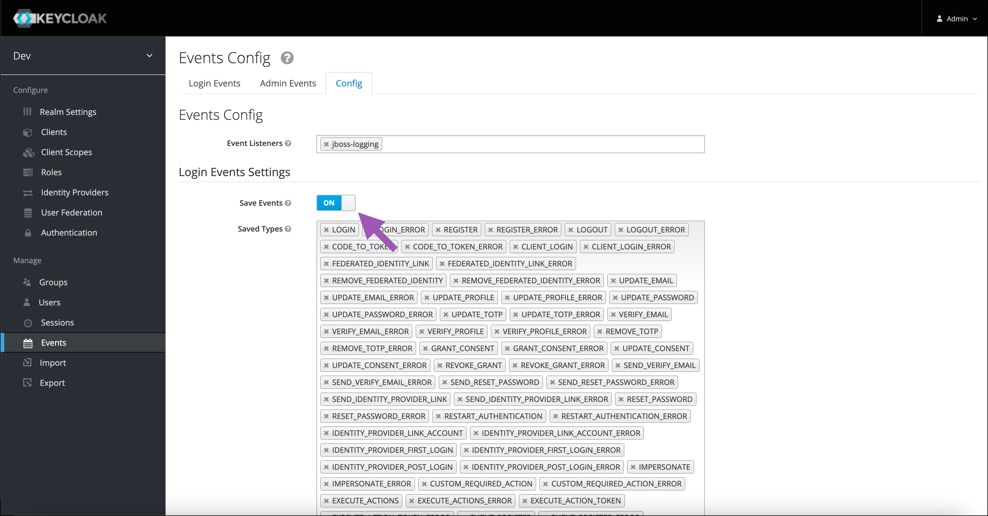 You must have Events enabled within Keycloak to track login events.- Log in to Keycloak as an administrator.