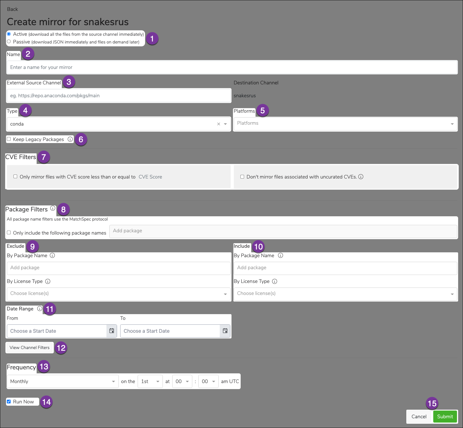 Make the changes you’d like implemented, then click Submit. If the Run Now box is not checked, your mirror will run the next time its frequency configuration instructs it to do so.