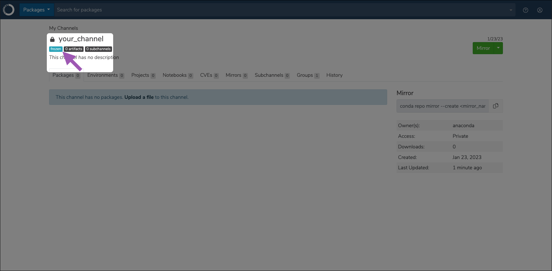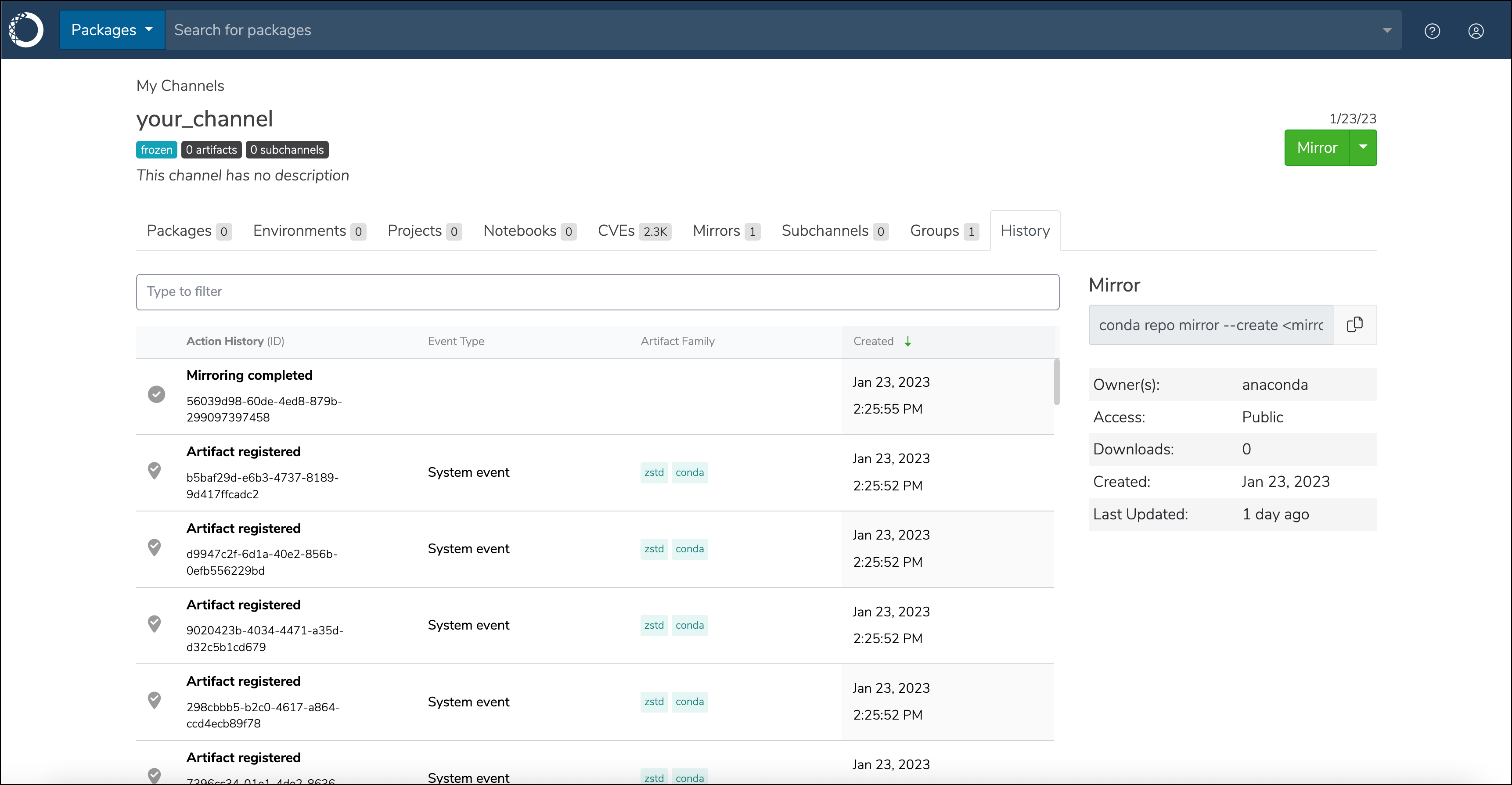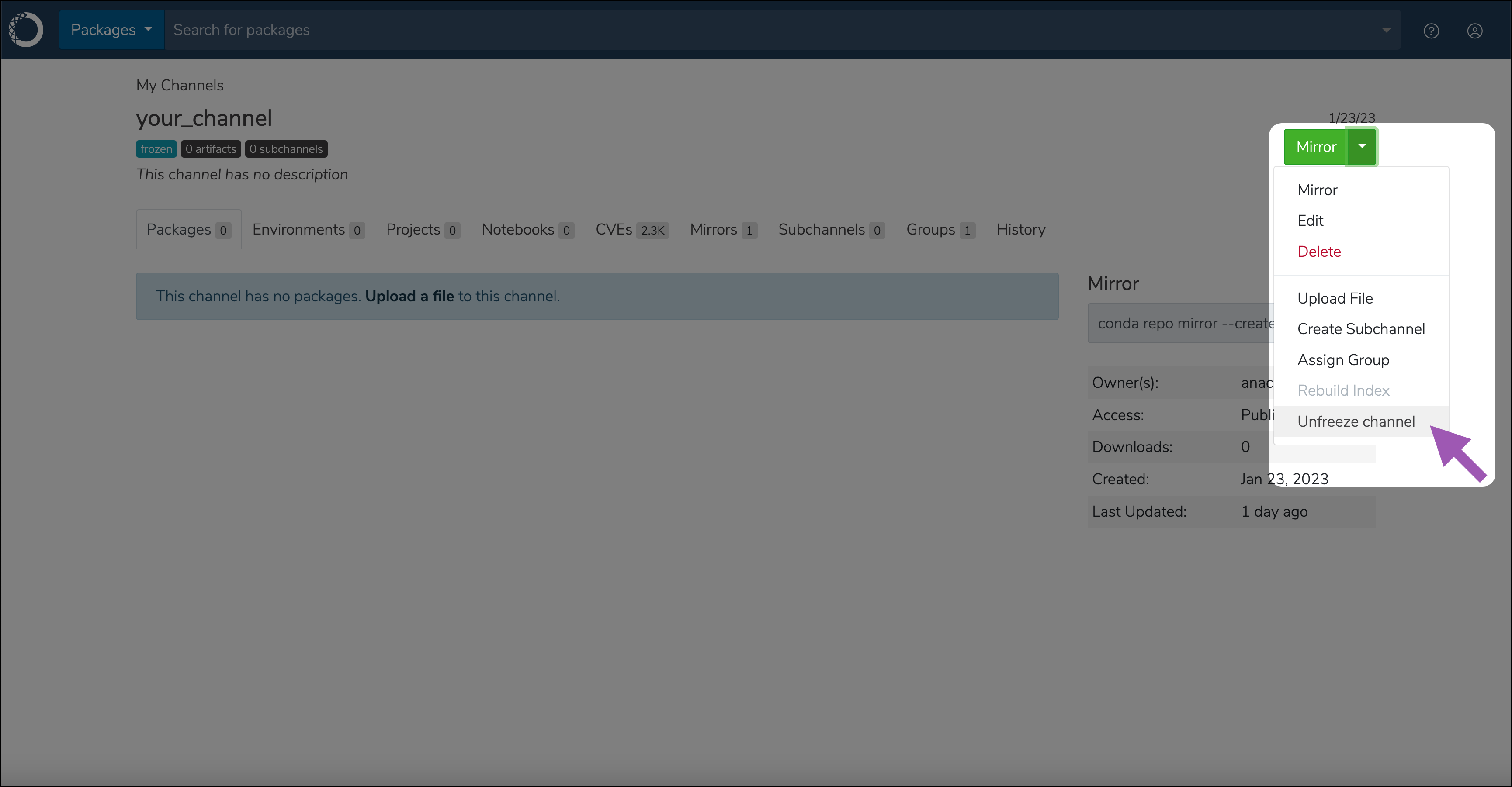 Creating a mirror consumes a large amount of CPU resources. This is because, each time an artifact is added to the channel from the mirror, the channel index is rebuilt to add the artifact to the Packages tab of your channel. If you want to conserve or reduce your CPU usage, you can freeze your channel before creating a mirror to prevent the channel index from being rebuilt every time an artifact is registered from the mirror’s source.Because the channel index is prevented from being built, the Rebuild Index option is disabled while a channel is frozen. Channels and subchannels that are frozen also have their Move and Delete options disabled for packages, projects, environments, and notebooks. In addition, you cannot Copy packages to a channel that is frozen.