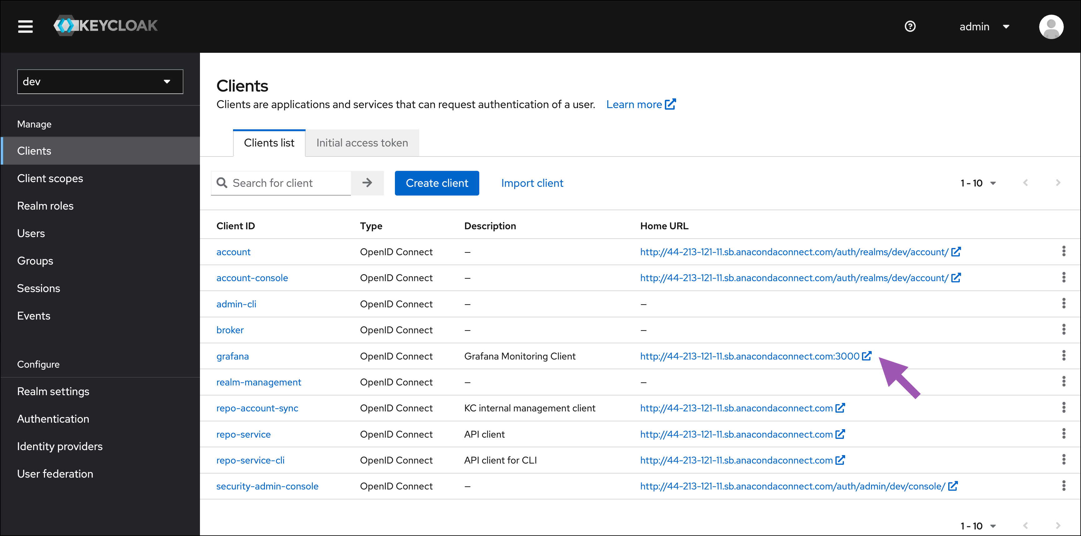 To access the Grafana dashboards via the Keycloak administrative console, complete the following steps: