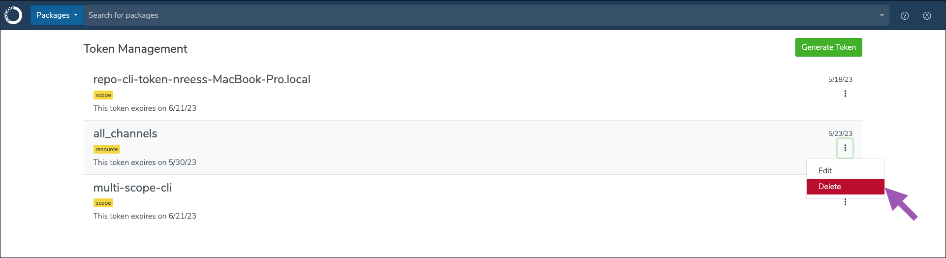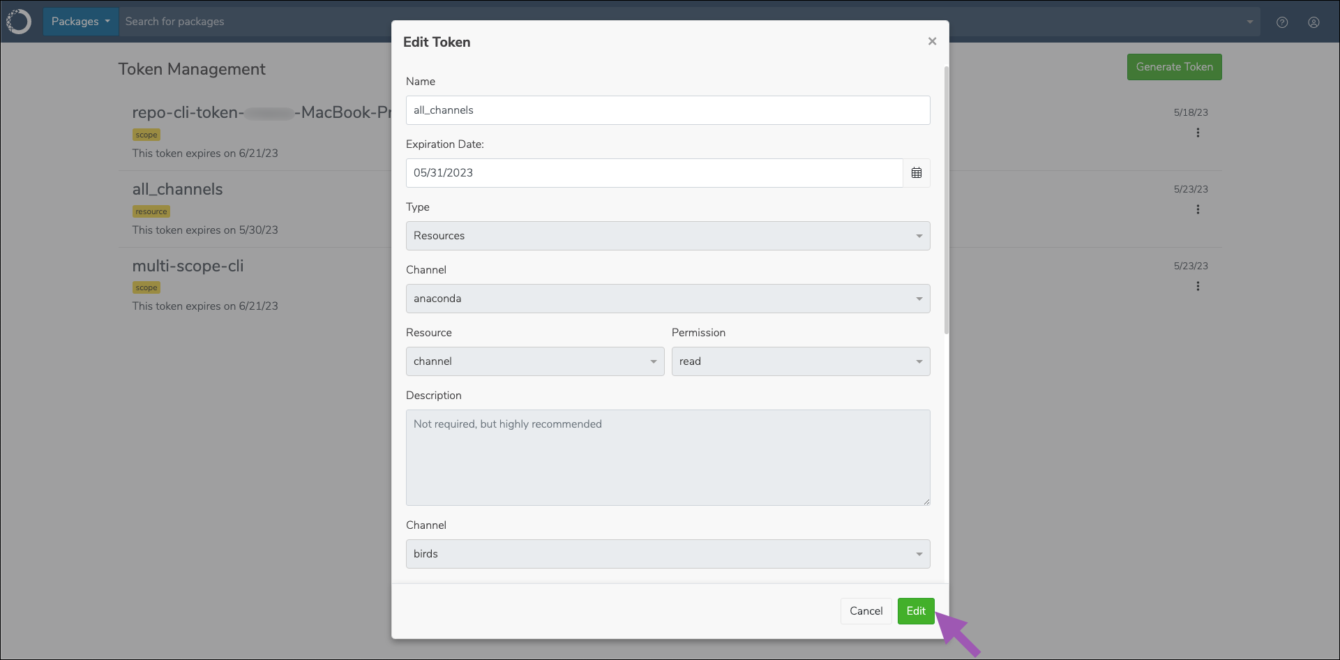 You can edit a token to change its name or to update its expiration date. You can choose to issue a new token while editing as well, which will invalidate the previous string associated with the token. To edit a token:- Log in to Anaconda Server.