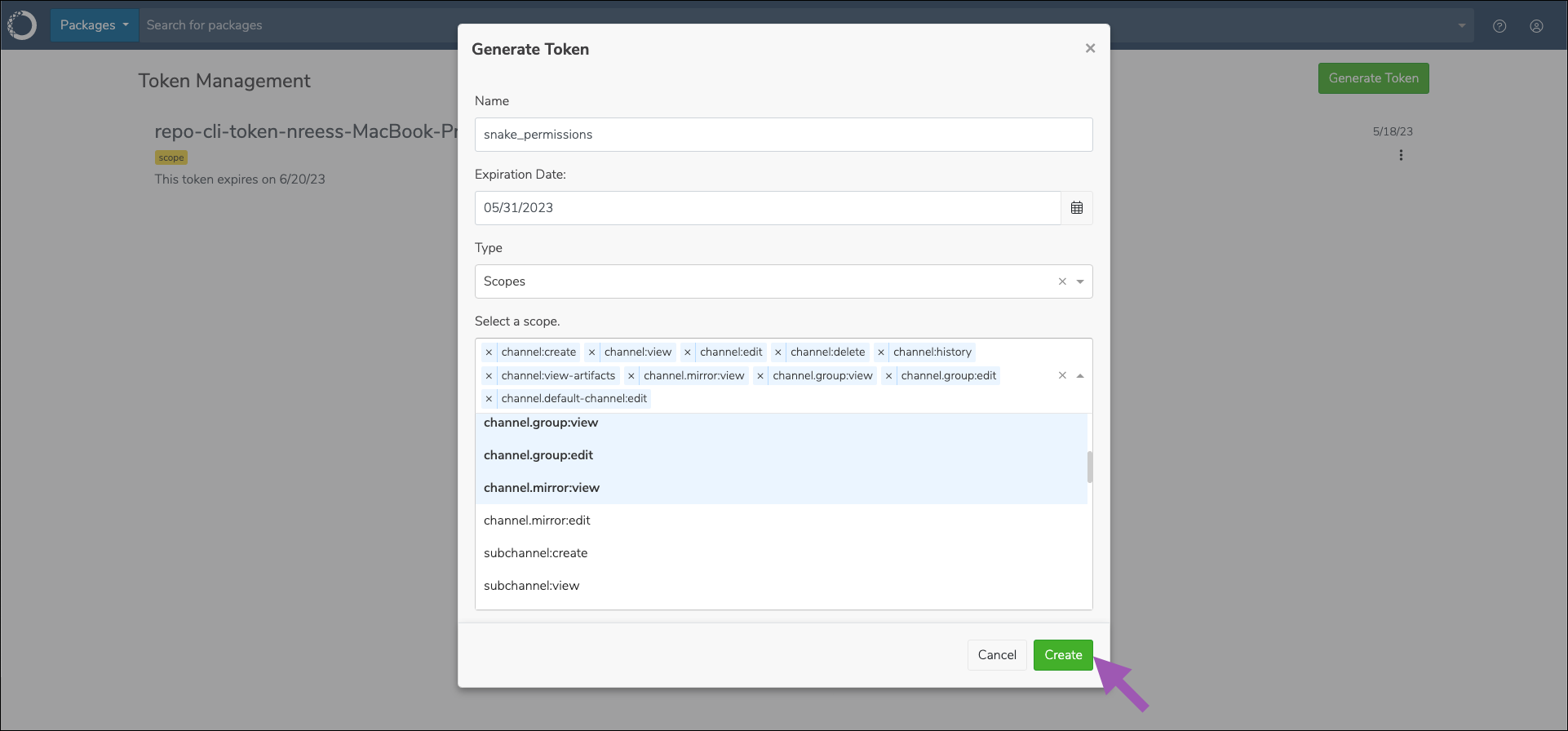 - Open the Select a scope dropdown menu and select a scope to add to the token. Repeat as necessary to build a custom set of permissions for your token holders.