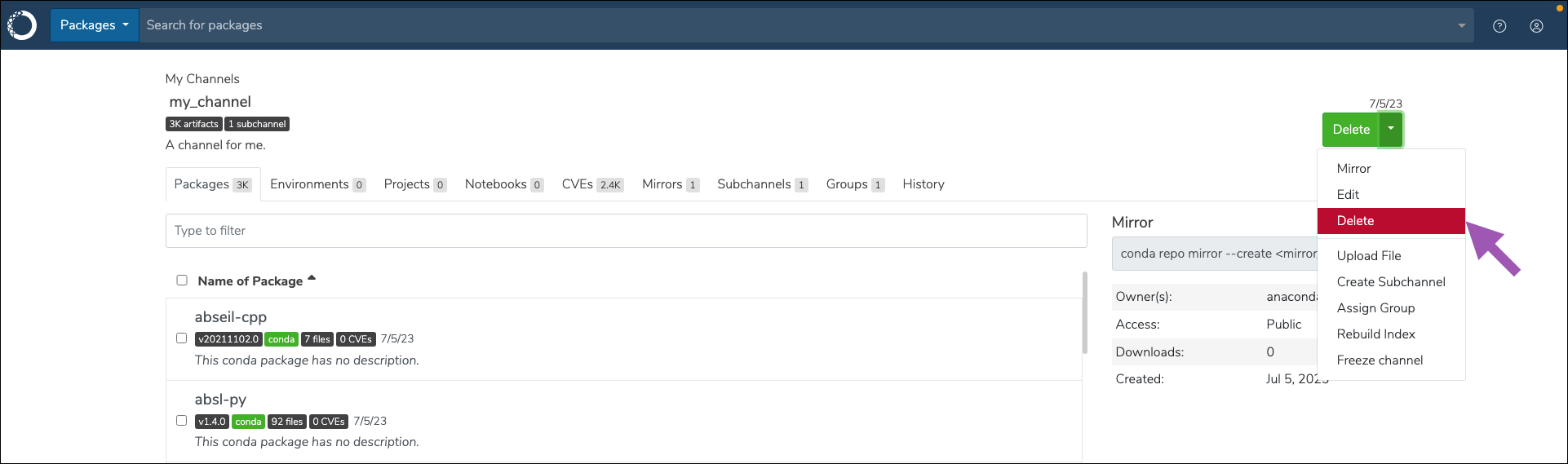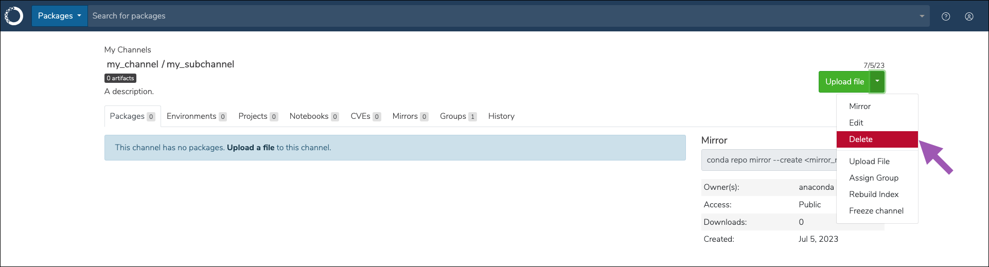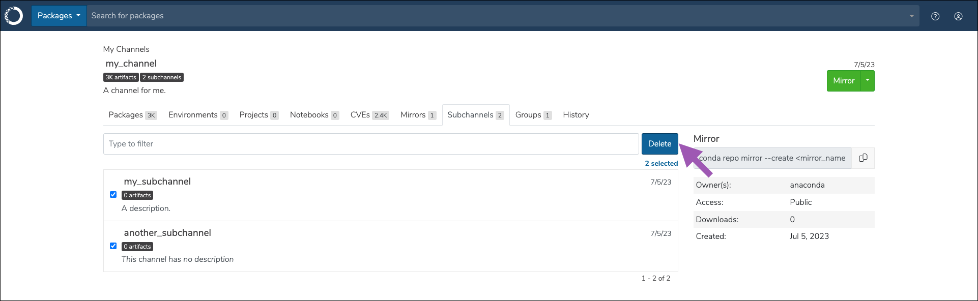 To delete a subchannel in Anaconda Server:- Navigate to the subchannel’s details page.