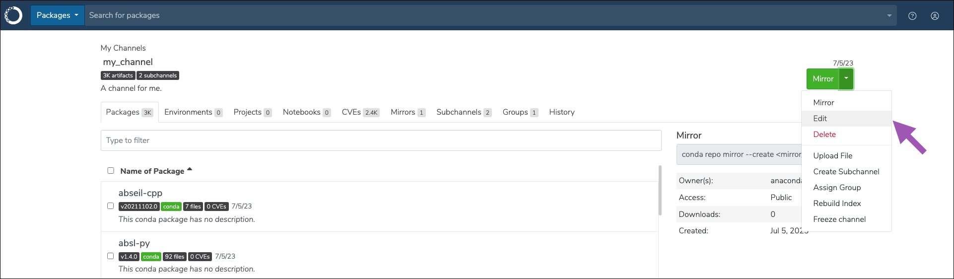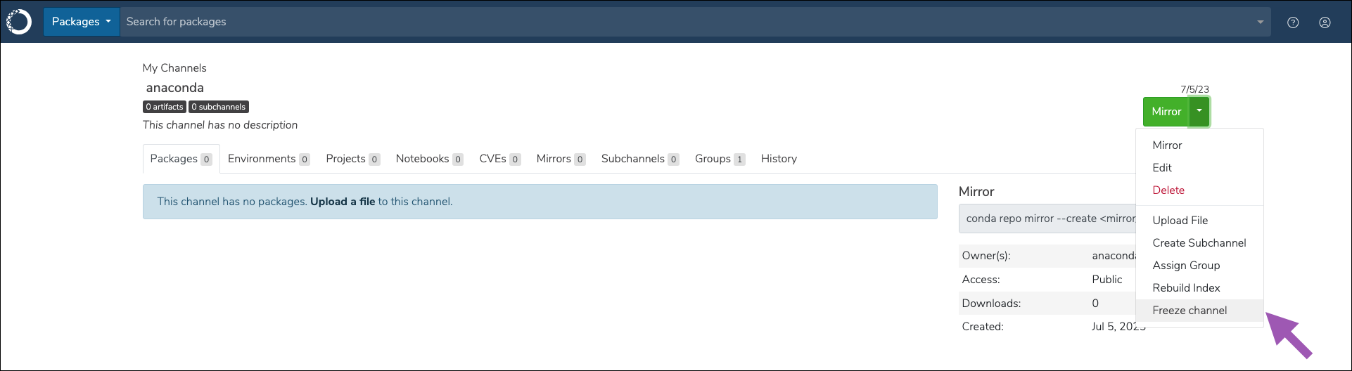 Creating a mirror consumes a large amount of CPU resources. This is because, each time an artifact is added to the channel from the mirror, the channel index is rebuilt to add the artifact to the Packages tab of your channel. If you want to conserve or reduce your CPU usage, you can freeze your channel before creating a mirror to prevent the channel index from being rebuilt every time an artifact is registered from the mirror’s source.Because the channel index is prevented from being built, the Rebuild Index option is disabled while a channel is frozen. Channels and subchannels that are frozen also have their Move and Delete options disabled for packages, projects, environments, and notebooks. In addition, you cannot Copy packages to a channel that is frozen.