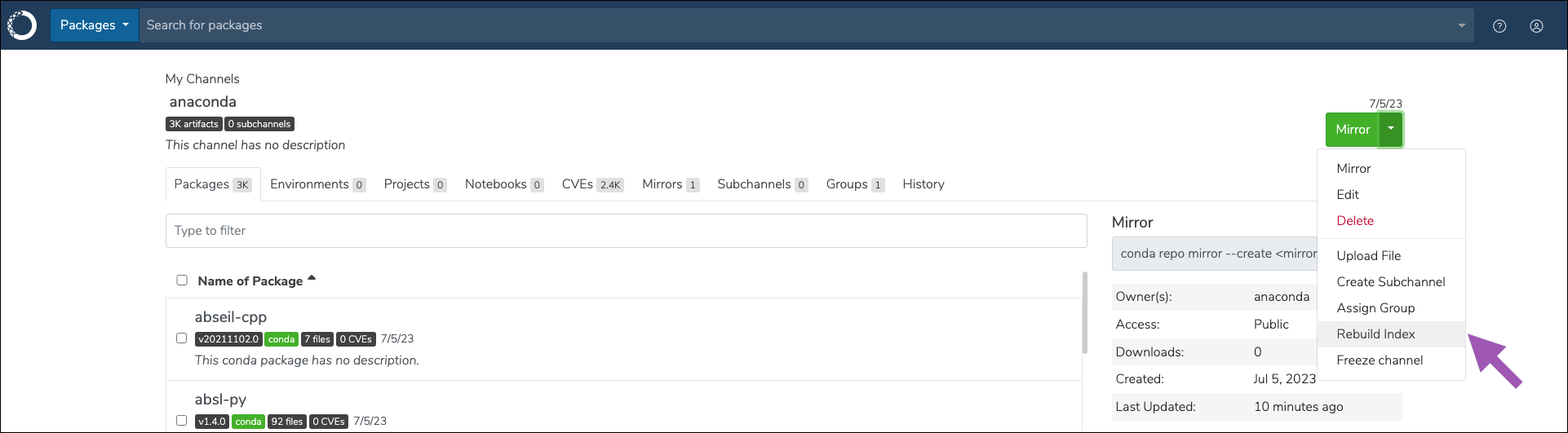 The channel index is automatically rebuilt when certain actions, such as adding or deleting a package, are made. However, if you need to manually rebuild your channel’s index for any reason, follow these steps:- Navigate to the channel’s details page.