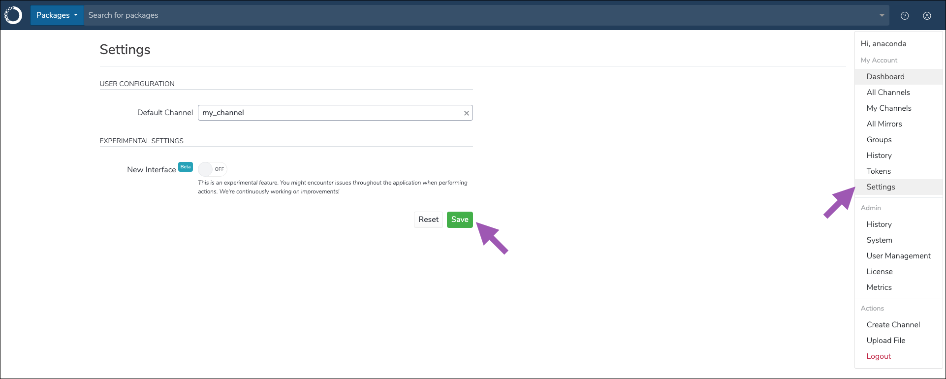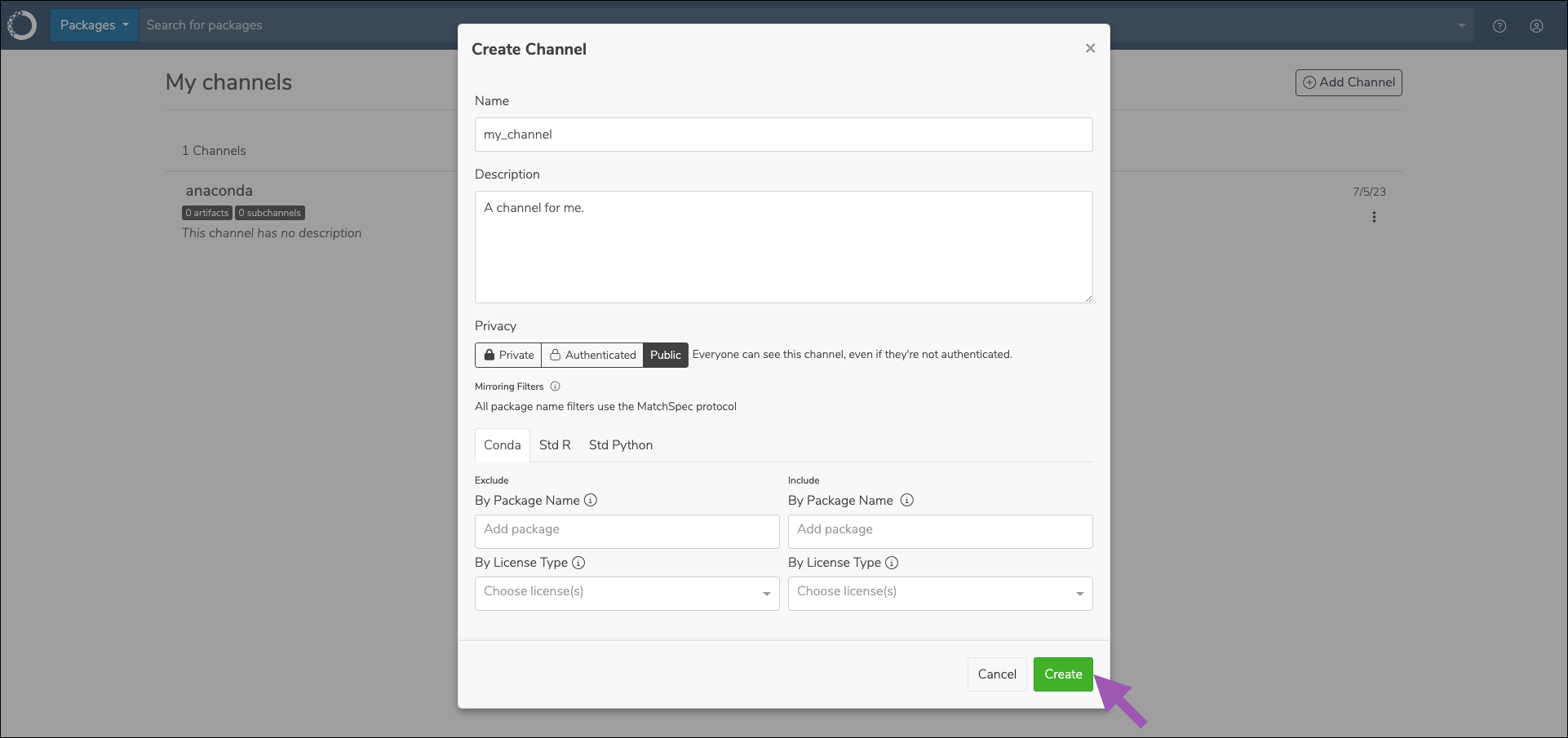 If you want to create and manage your channels using the CLI, see Anaconda Server CLIManaging channels with the API