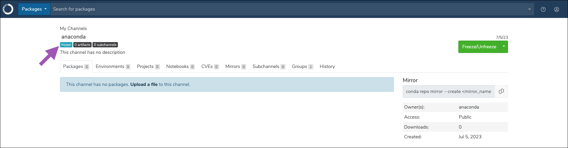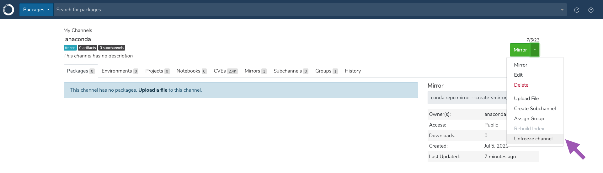 Once the mirror completes, unfreeze the channel to rebuild the channel index. To unfreeze a channel:- Navigate to the channel’s details page.