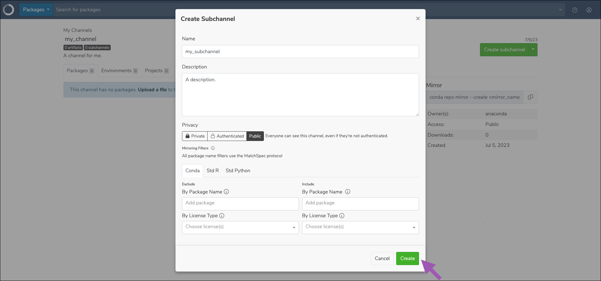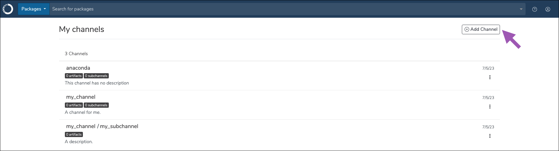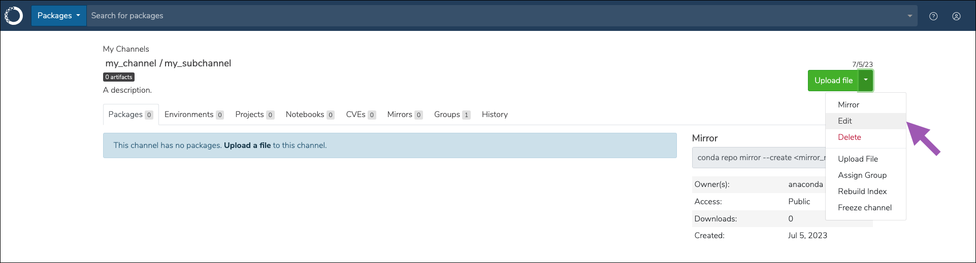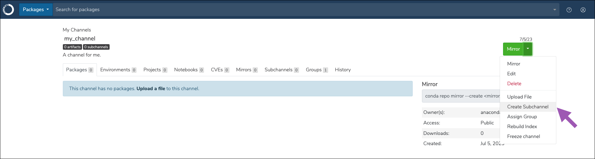 To create a subchannel in Anaconda Server:- Navigate to a channel’s details page.