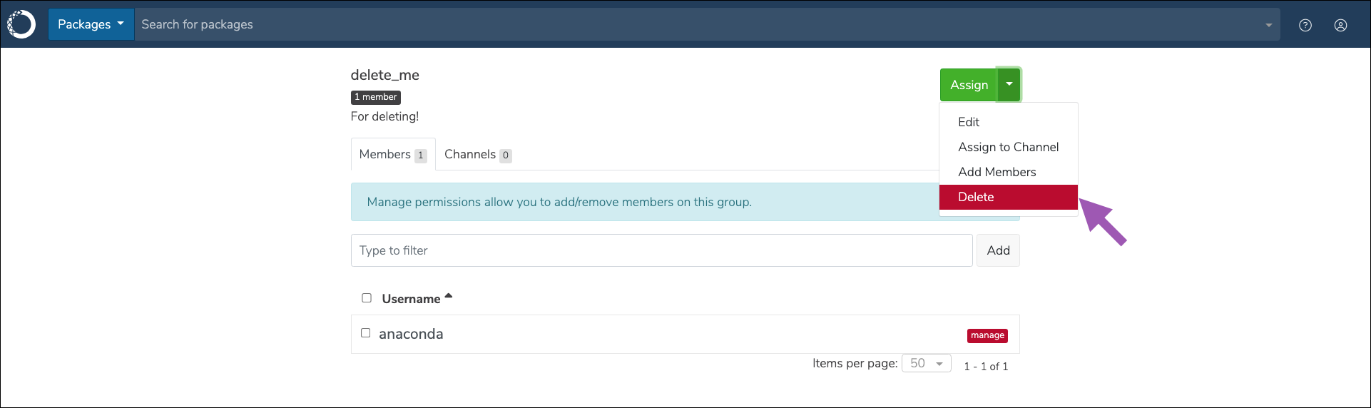Only the group owner can delete the group. To delete a group, complete the following steps:- Log in to Anaconda Server.
