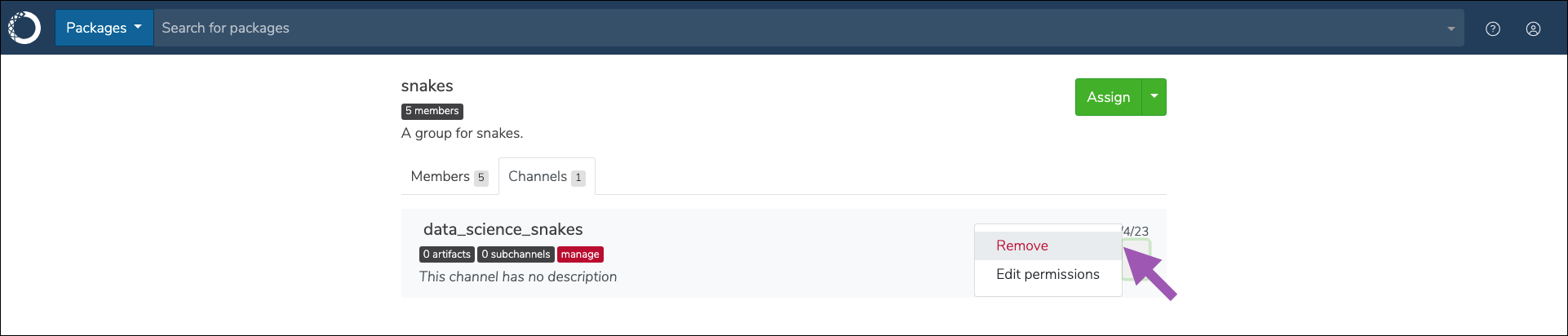 To remove channels from a group, complete the following steps:- Log in to Anaconda Server.