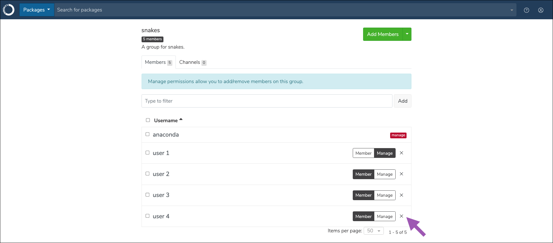 To remove members from a group, complete the following steps:- Log in to Anaconda Server.