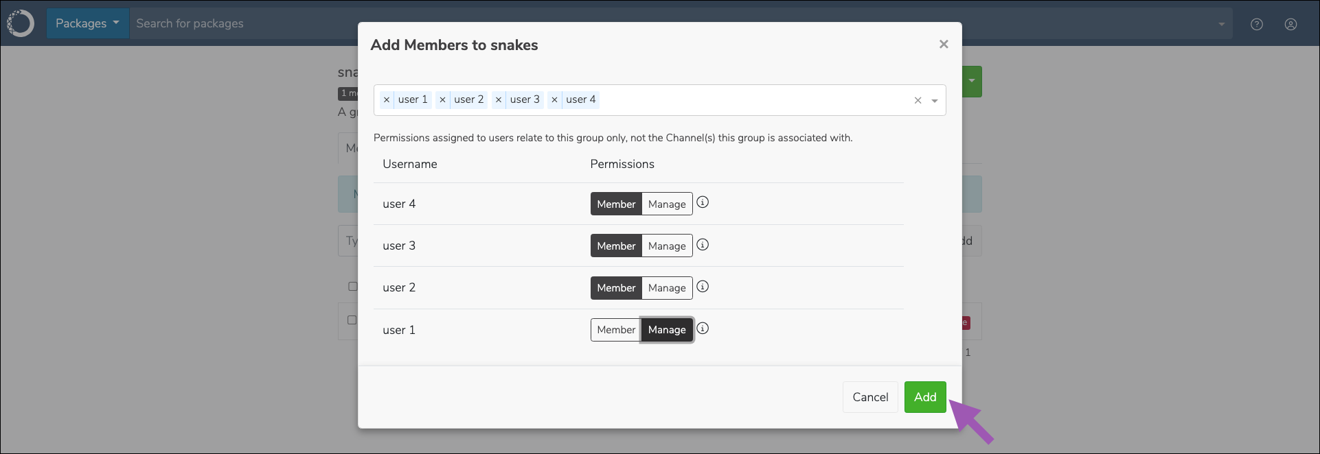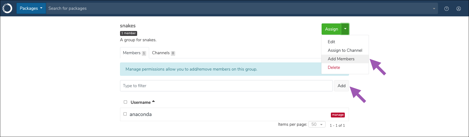 To add members to a group, complete the following steps:- Log in to Anaconda Server.