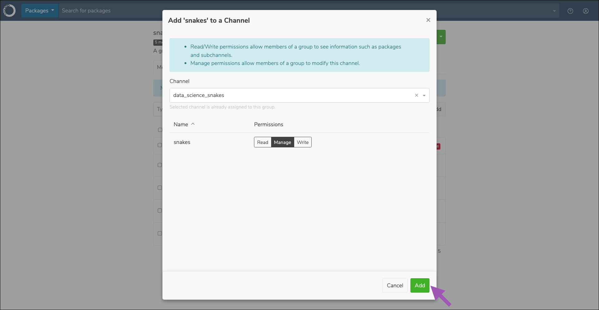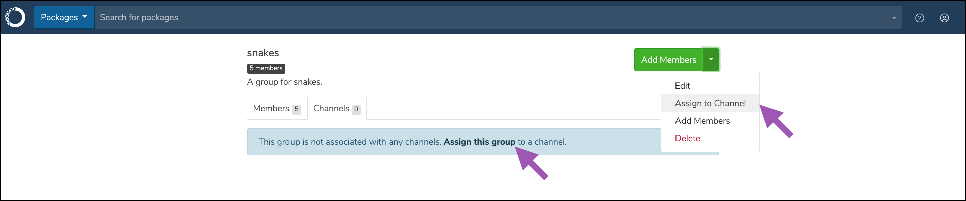 To add channels to a group, complete the following steps:- Log in to Anaconda Server.